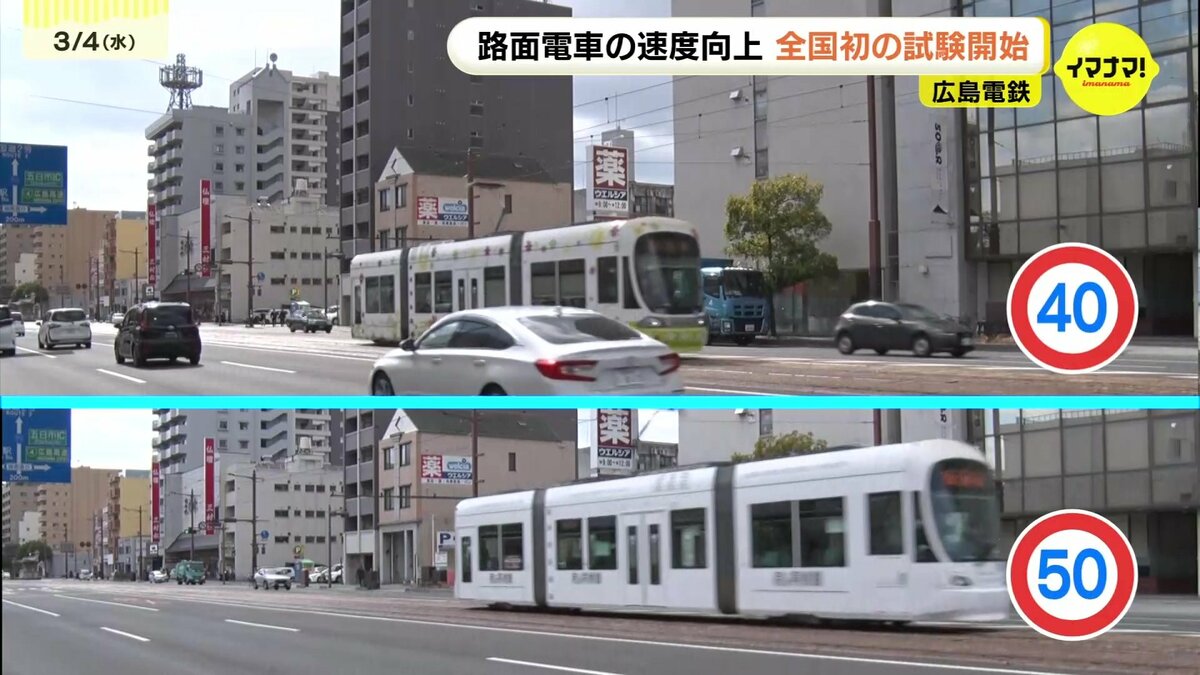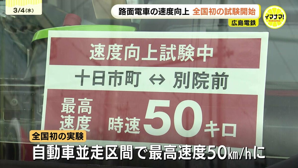 路面電車は、法律で最高速度が時速40km以下に制限されていました。そこで、国や警察と広島電鉄などが検討を重ね、自動車と並走する区間で最高速度を時速50kmに引き上げる実験を全国で初めて行うことになりました。