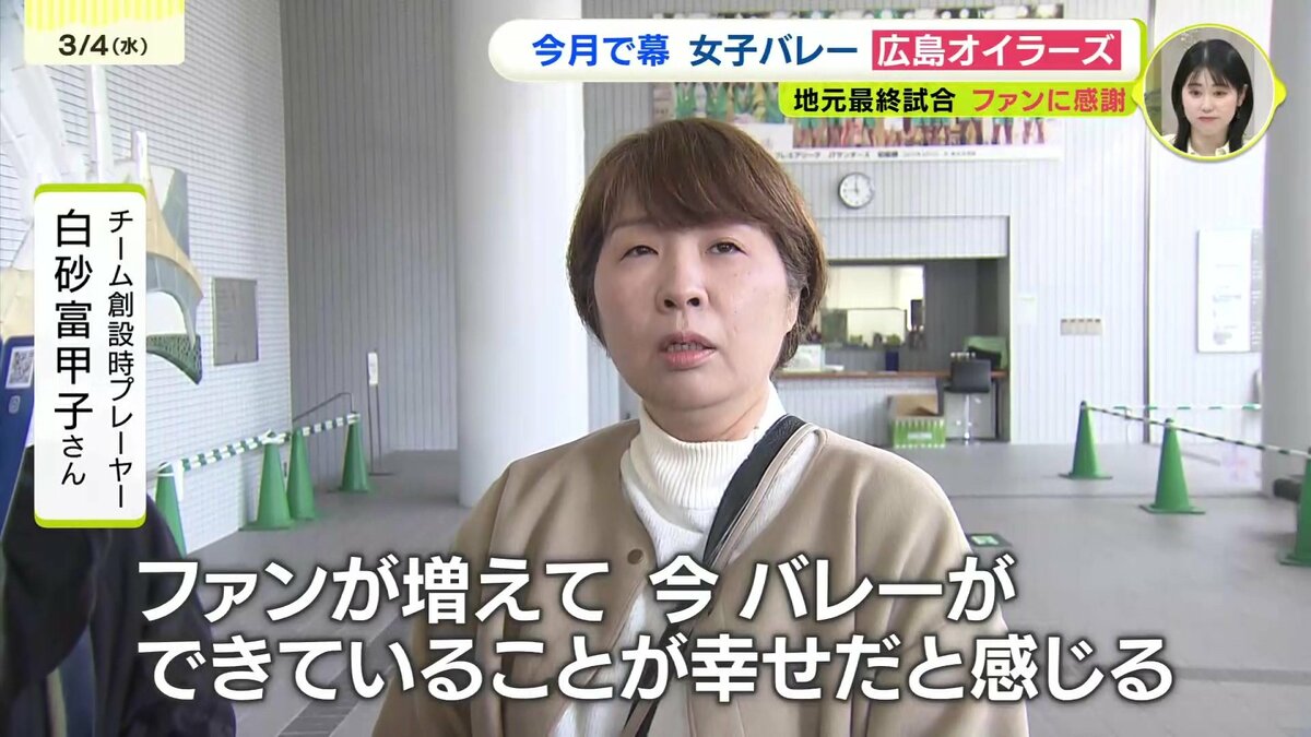 「ファンが増えて、今こうやってバレーが出来ていることが幸せだと感じる。無くなるのはとてもさみしい。自分の子どもの世代の子たちが活躍しているので子どもを応援する気持ちで応援したい。」