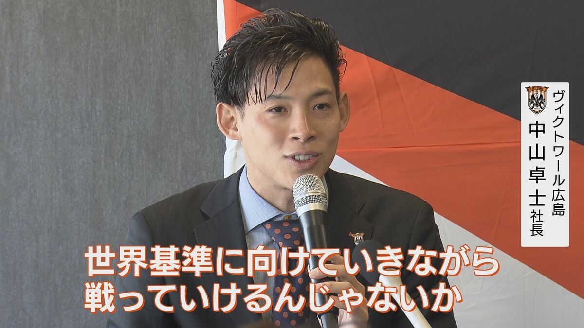 新しくなった広島競輪場で今月4日に行われたヴィクトワール広島の記者会見には中山卓士社長、西村大輝監督、昨年のクリテリウム王者・孫崎大樹、ネーミングスポンサーのマリモホールディングス深川真社長が出席しました。