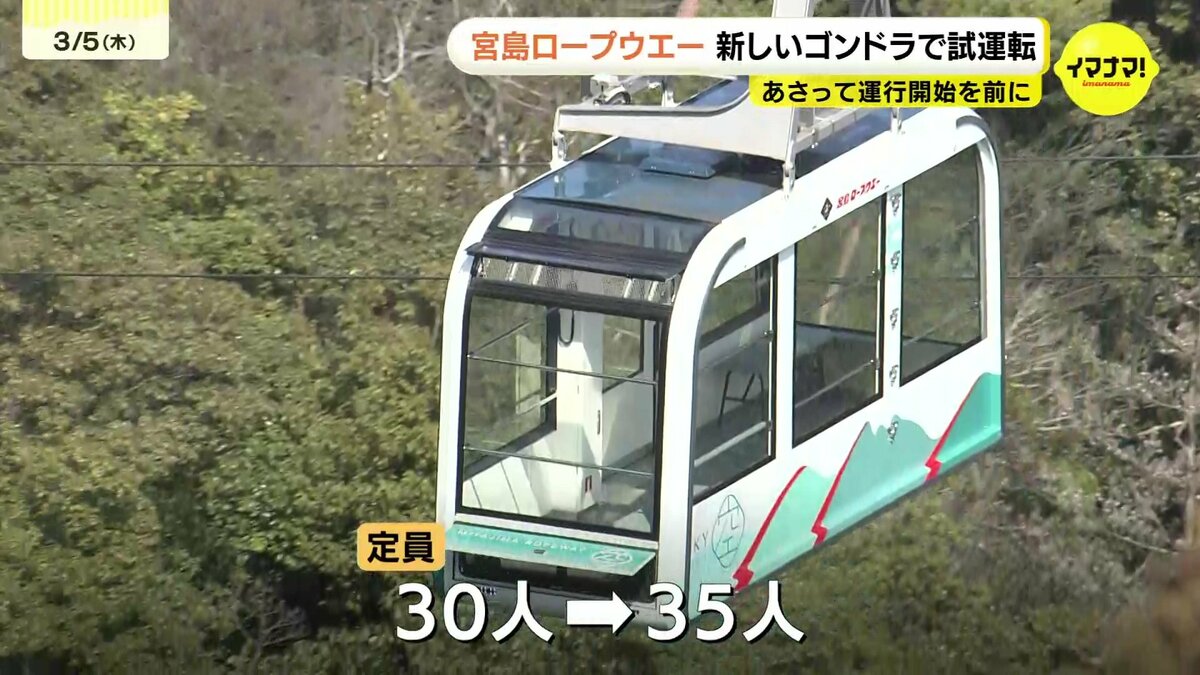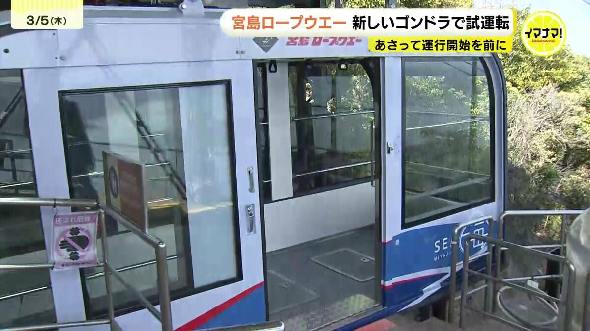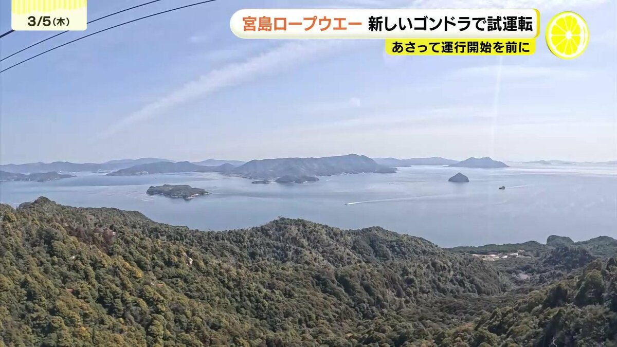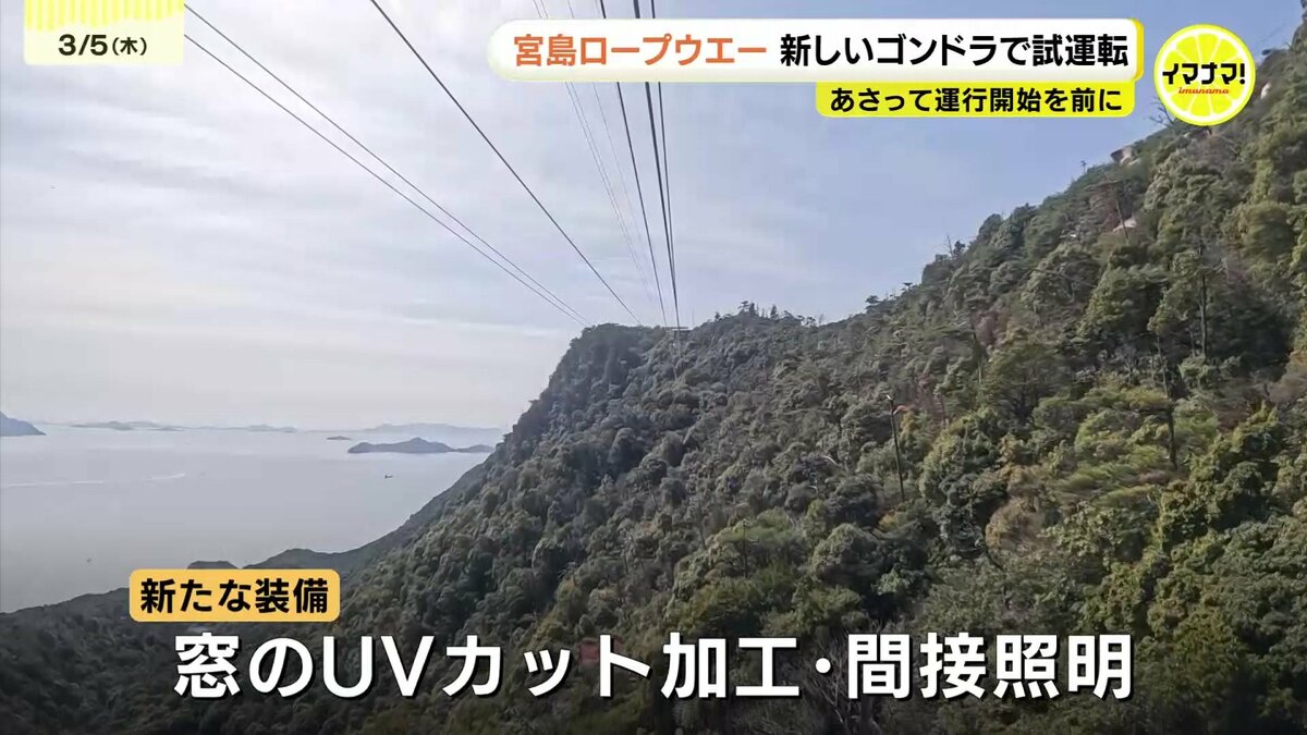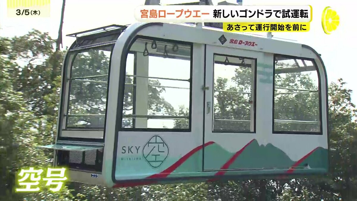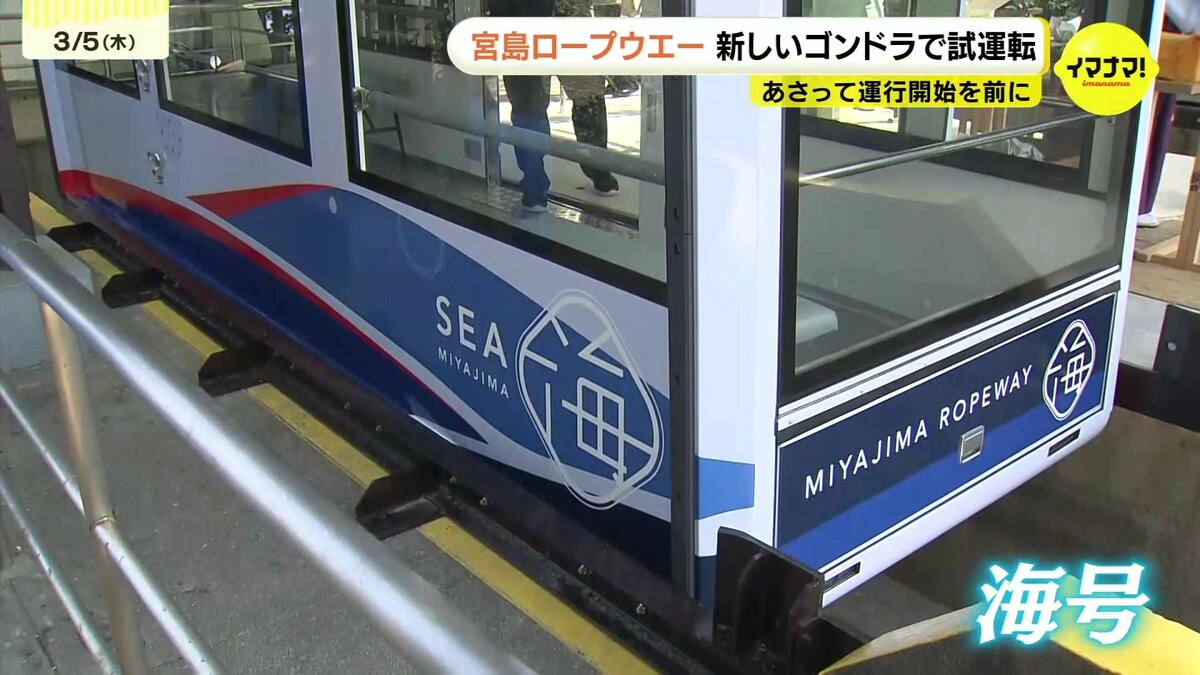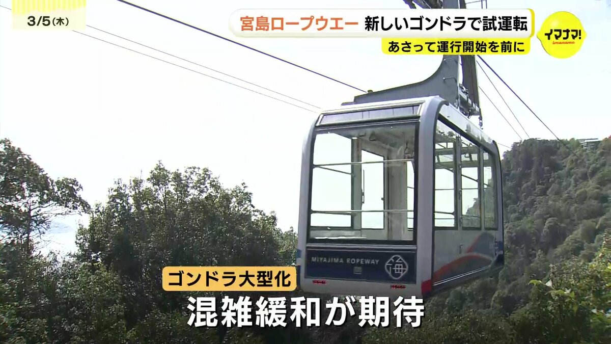 広島県廿日市市の宮島ロープウエーで、7日から新しいゴンドラが運行を開始します。5日、本格運行を前に試運転がおこなわれました。