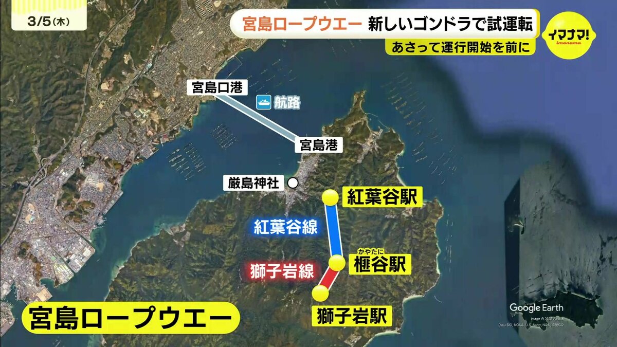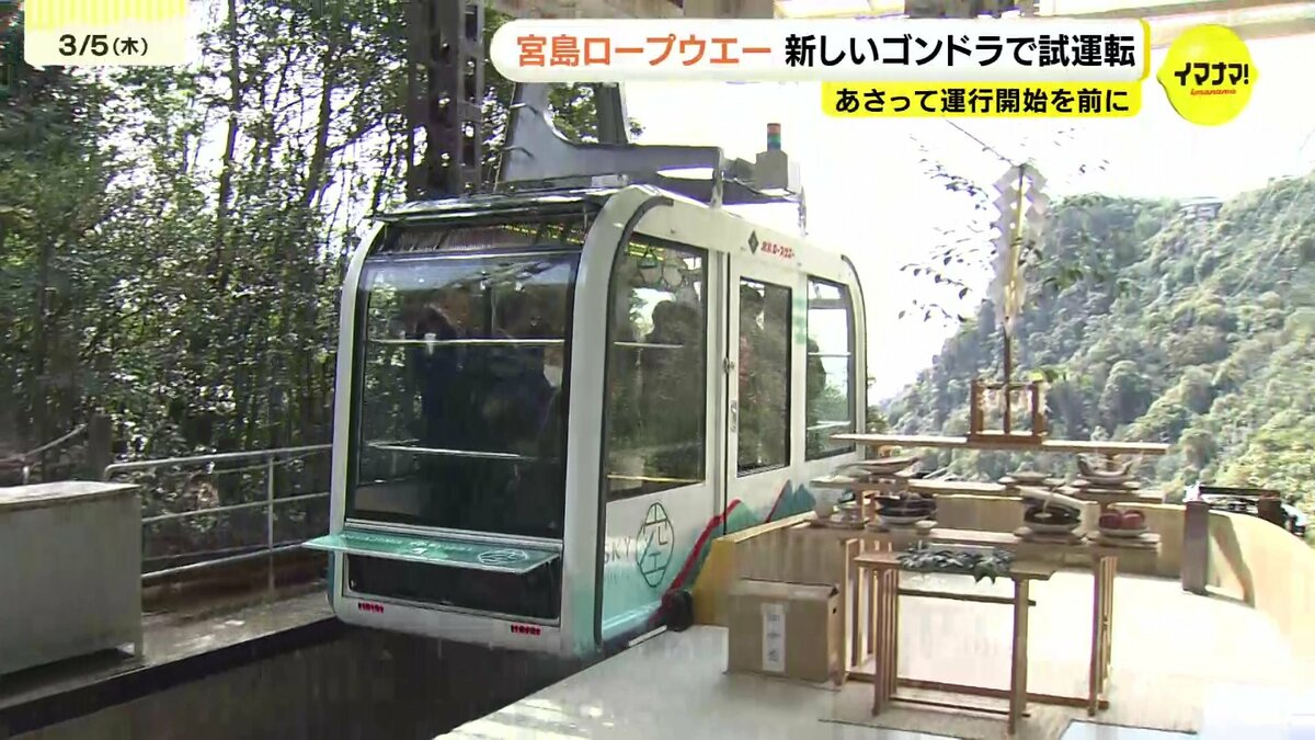 5日午前、厳島神社の宮司が安全を祈願し、関係者を乗せた試運転がはじまりました。交走式と呼ばれる方式で運行され、一方のゴンドラが登ると、もう一方のゴンドラが降りる仕組みとなっています。