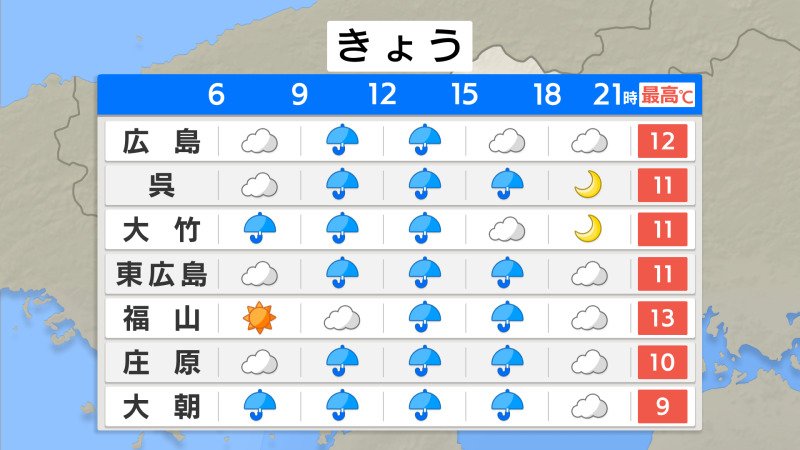 けさ(6日朝)の広島県内は、すでに西から雨雲が流れ込んでいます。日本海にある低気圧に向かい南寄りの風が吹いています。朝の冷え込みは弱く最低気温は、広島市中区で6.5℃・福山市3.9℃・庄原市0.7℃などでした。