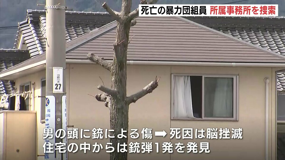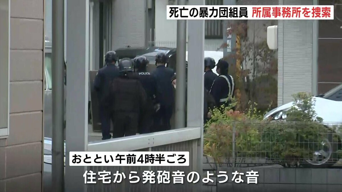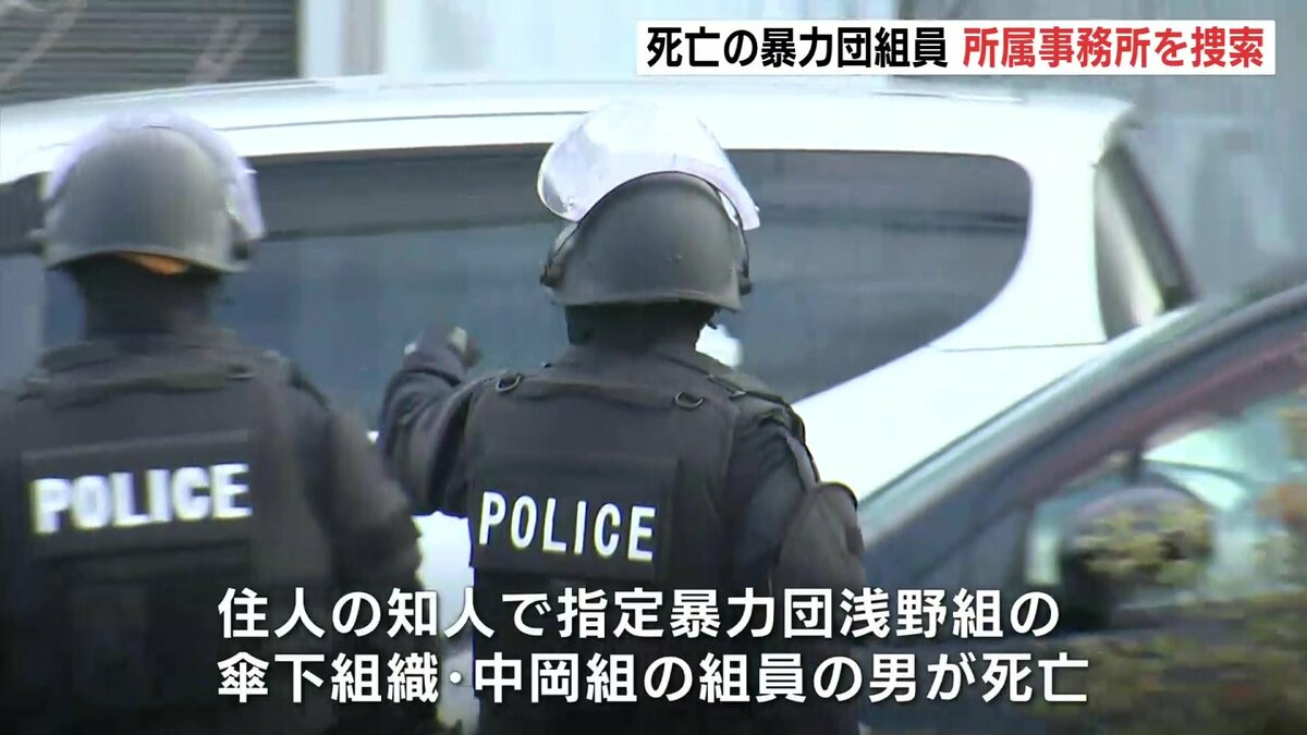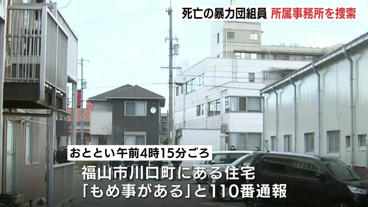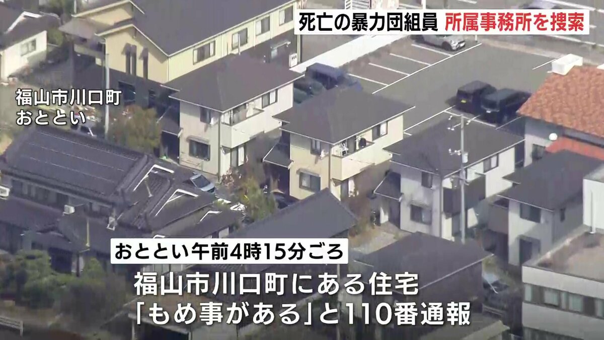 広島県福山市の住宅で発砲音のような音がした後、暴力団組員の男が死亡しているのが見つかった事件で、警察は6日、死亡した男が所属していた指定暴力団浅野組の傘下組織・中岡組の事務所を家宅捜索しました。