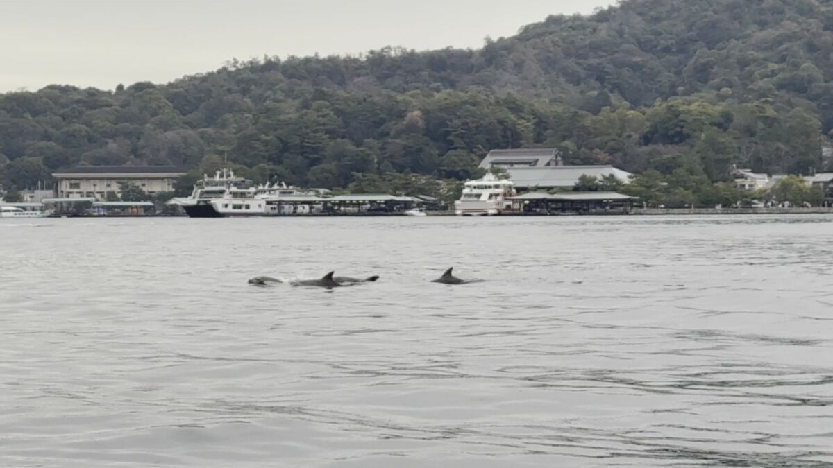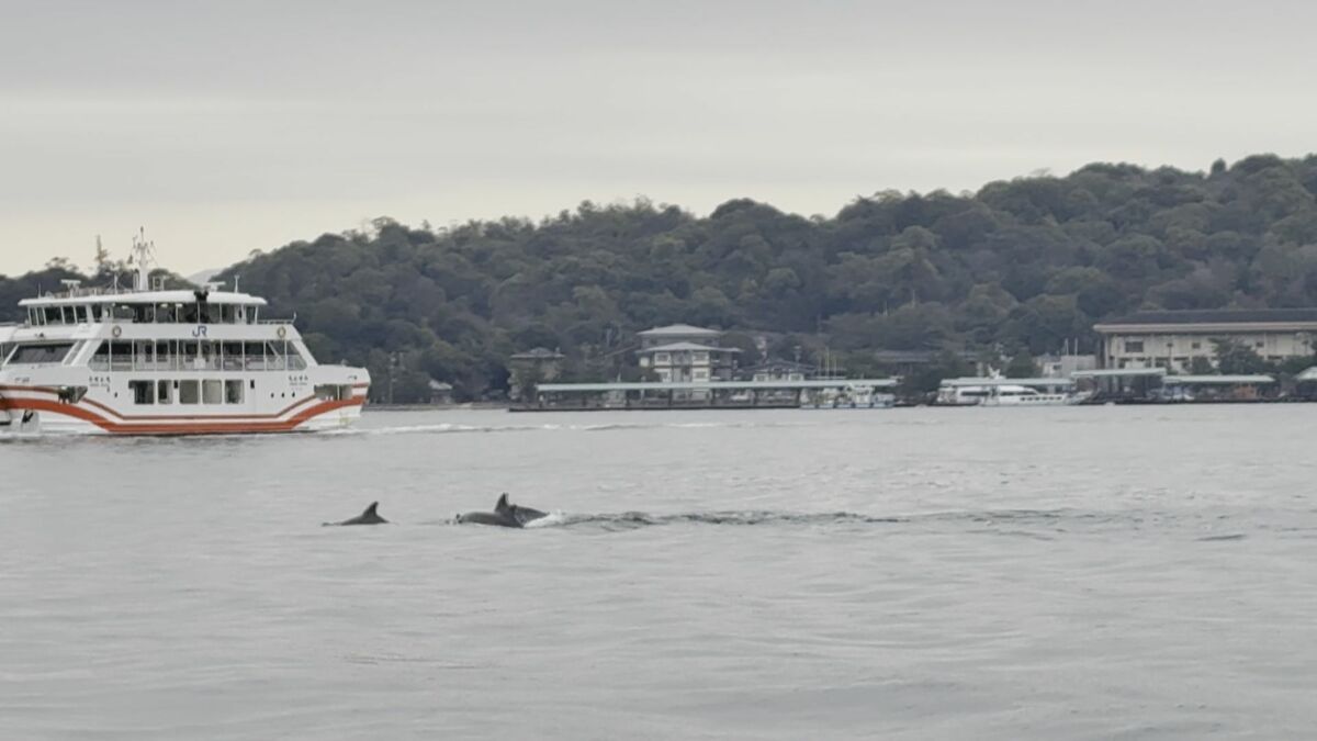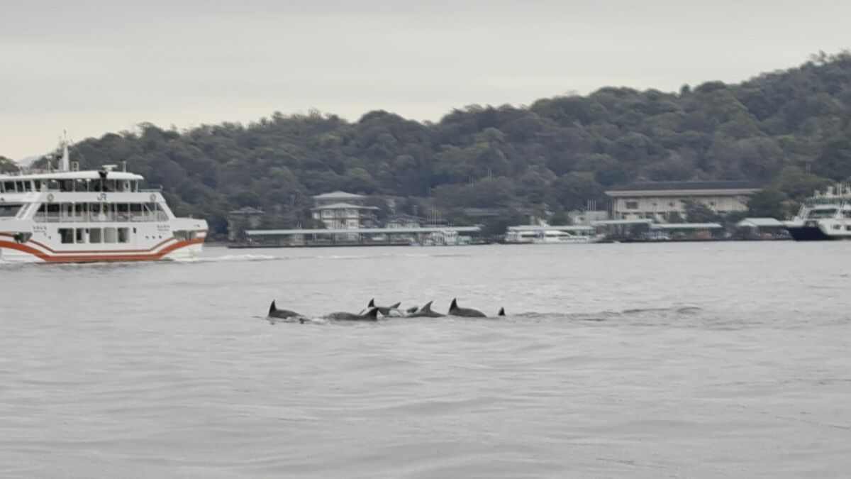 イルカの群れは、世界遺産・厳島神社の大鳥居やフェリーの近くを悠々と泳いでいました。