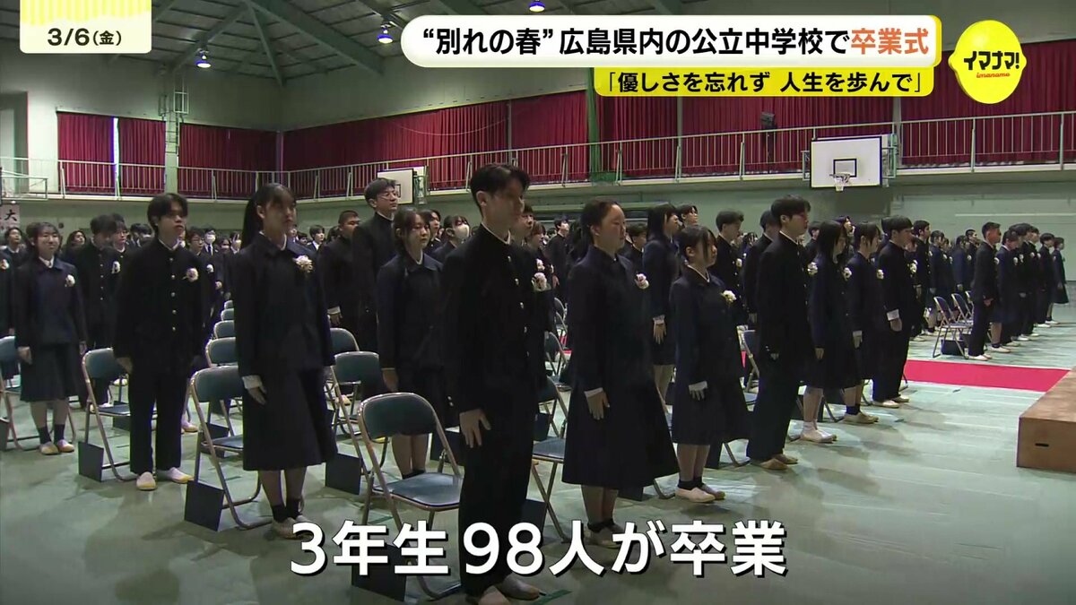 広島市中区の幟町中学校では、教員や保護者、在校生に見守られながら3年生98人が卒業しました。