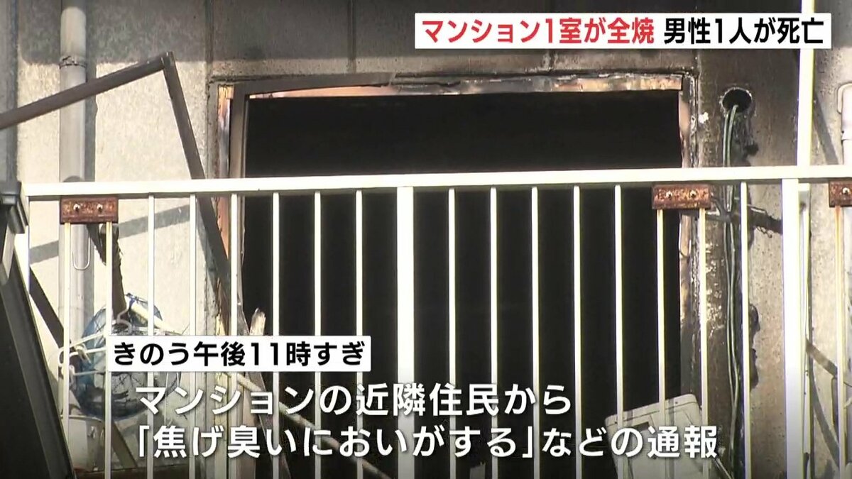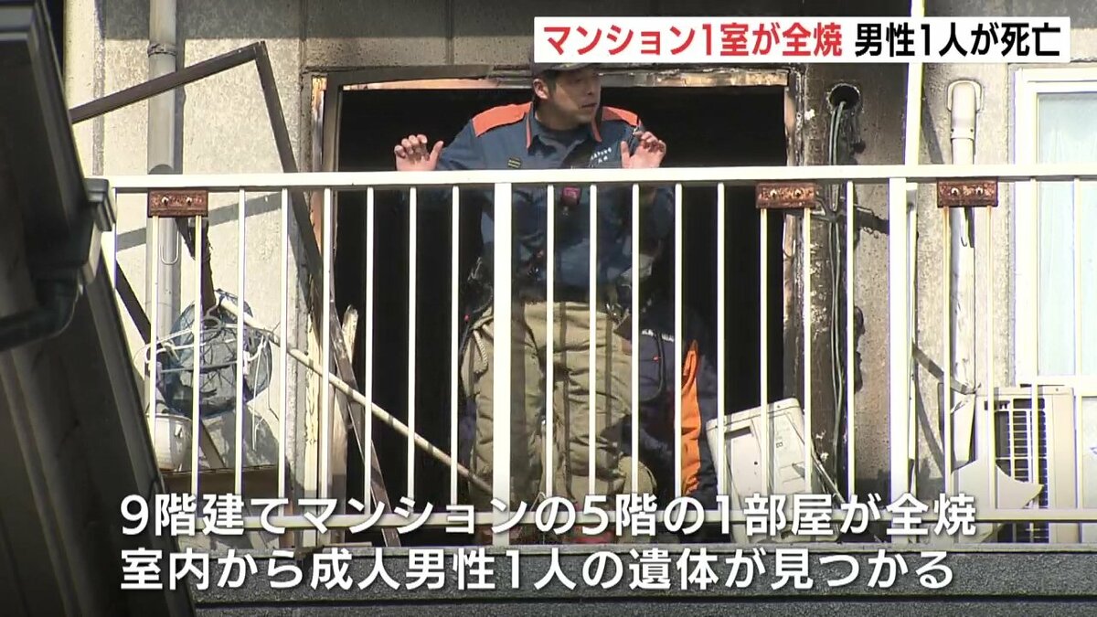 消防車13台が出動し、火はおよそ1時間半後に消し止められましたが、9階建てマンションの5階の1部屋が全焼し、室内から成人男性1人の遺体が見つかったということです。