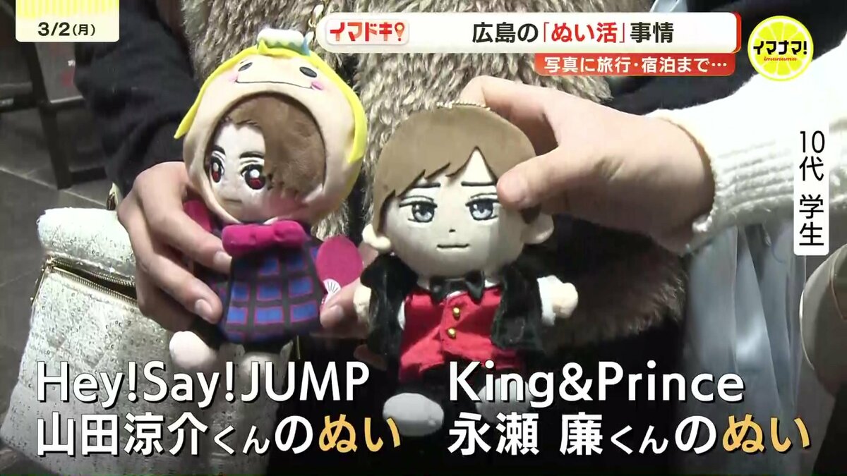 「King & Prince永瀬廉くんで、これは、Hey! Say! JUMPの山田涼介くんのぬいです。今日は遊ぶから持ってきた。二人で旅行に行くので、その時に使う用で、サンリオが出してる着ぐるみをお揃いで買いました。ぬいがあると、オタ活が楽しくなると思う」