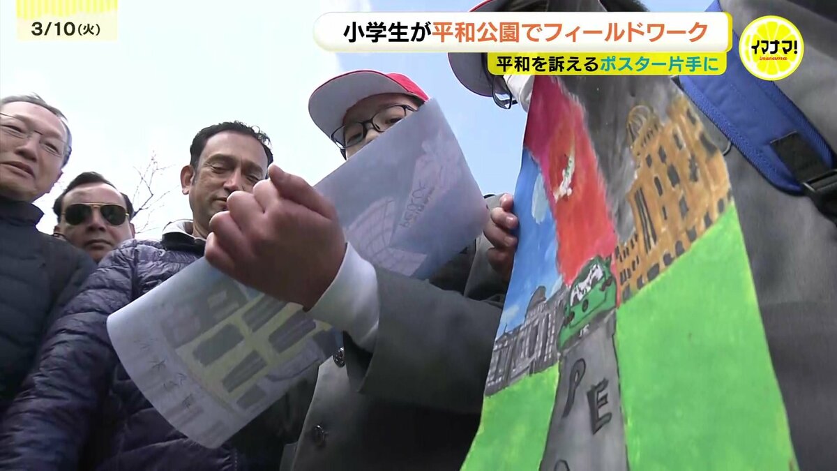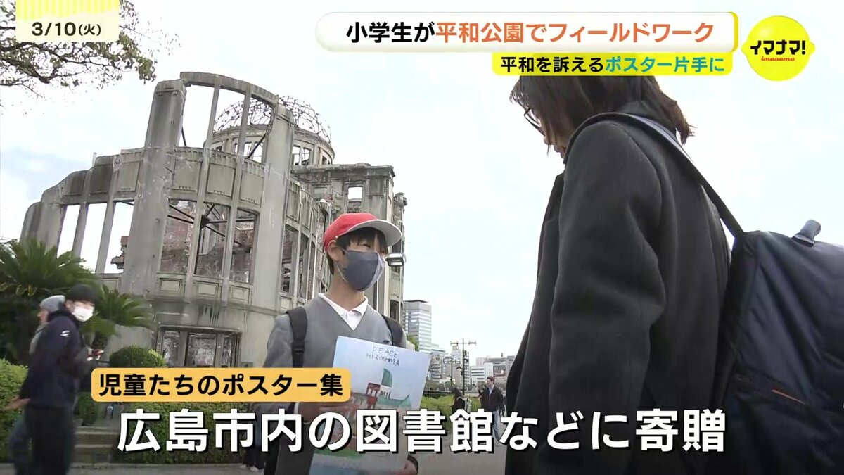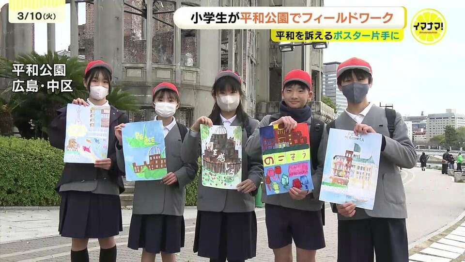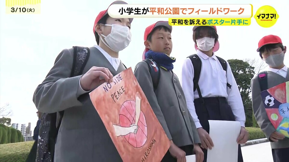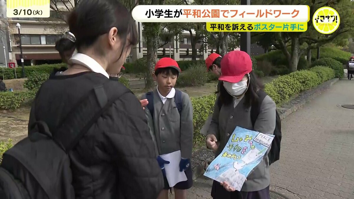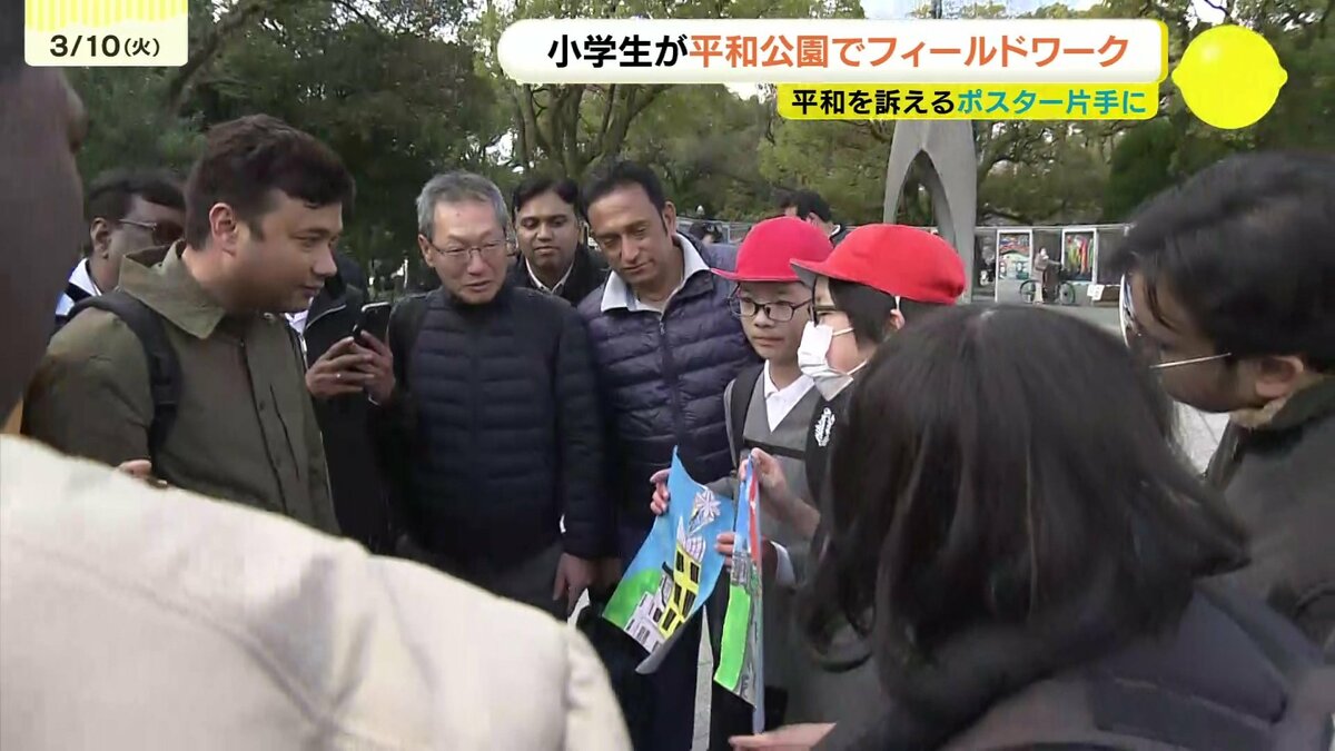 広島の小学生が平和を訴えるポスターを作り、平和公園でフィールドワークを行いました。