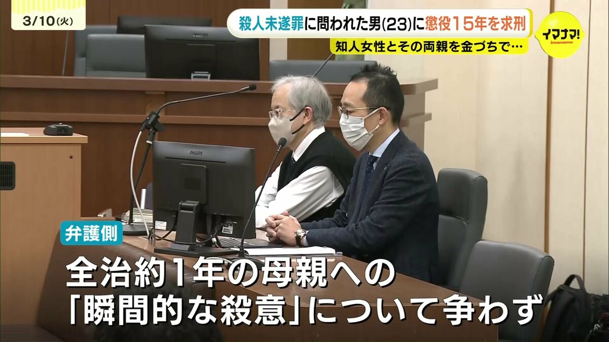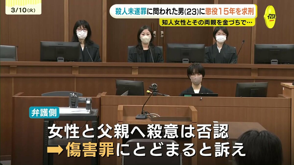 一方、弁護側は、全治およそ1年の大けがした母親への「瞬間的な殺意」については争わない姿勢を示しました。一方で、金づちで殴ったことについては「気絶させるのが目的だった」などと主張。住居侵入と母親への殺人未遂罪は認めたものの、女性と父親への殺意は否認し、傷害罪にとどまると訴えました。