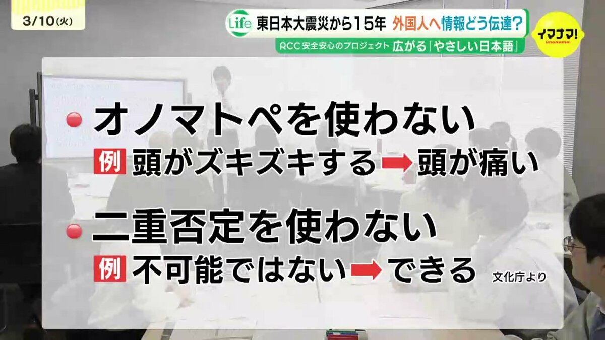 「やさしい日本語」では小学3年生で学習する程度の漢字や表現を使い、一つの文の情報量を少なくします。また、「頭がずぎずぎする」のようなオノマトペは使わず、「不可能ではない」のような二重否定の表現は避けます。留学生のナタリーさんは、「やさしい日本語」の取り組みを今回初めて知ったと話します。