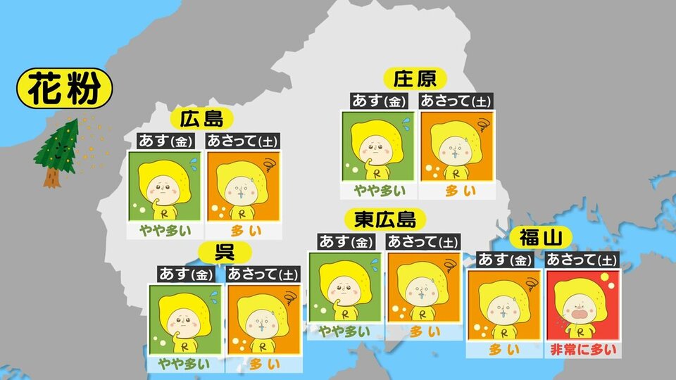 13日(金)の広島県内は、寒気の影響で山沿いを中心に雨や雪が降る見込みです。14日(土)は全域で日差しが届くでしょう。そのため、花粉は、13日(金)は「やや多い」、14日(土)は「多い」~「非常に多い」予想です。また、15日(日)以降は、晴れて気温が上昇する日が続き、連日「非常に多い」見込みです。