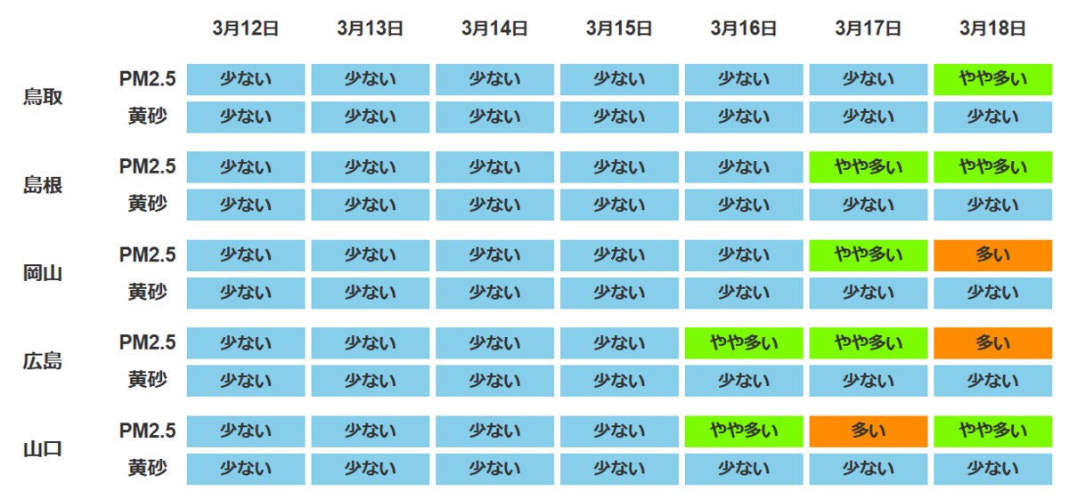 なお、PM2.5は15日(日)まで少ない予想です。(SPRINTARS開発チームより)しかし16日(月)からは、PM2.5が「やや多い」~「多い」予想。週が明けた頃からは、アレルギー症状が強く出るおそれがあります。花粉症の方は、より一層の対策をしてお過ごしください。