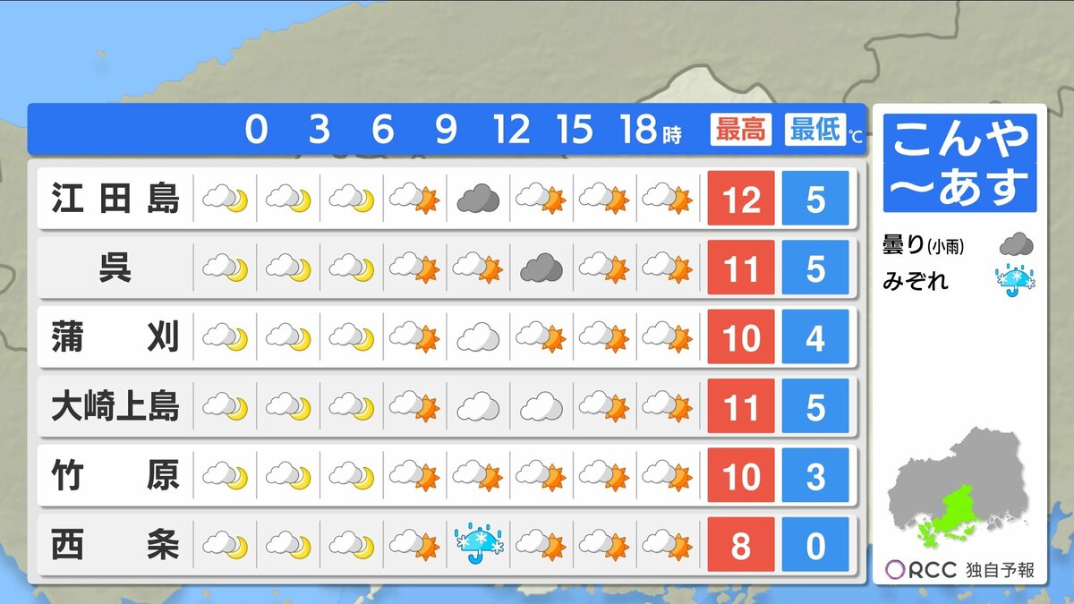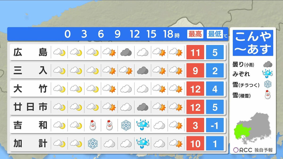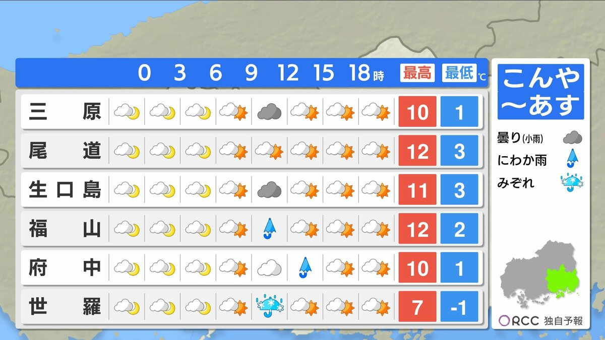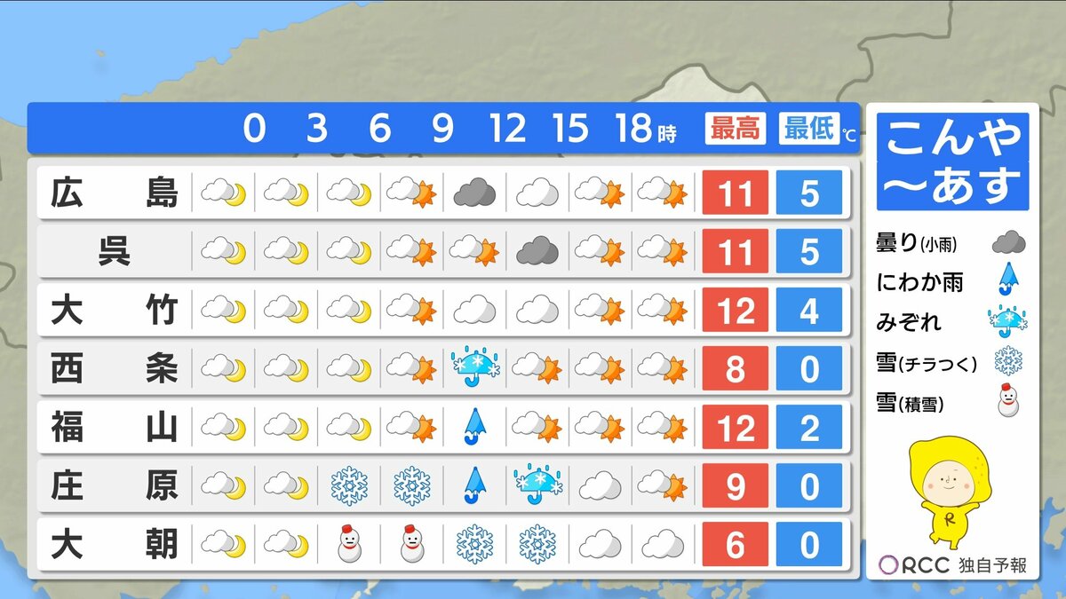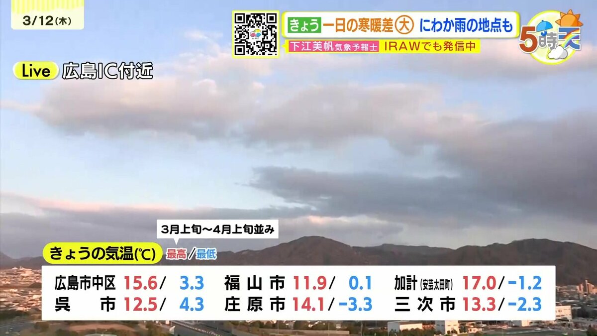 きょう3月12日(木)の広島県内は、朝からよく晴れ昼間はぽかぽか陽気になりました。ただ、昼過ぎからはにわか雨・雪の地点もありました。最高気温は、広島市中区で15.6℃ 加計17.0℃など、各地3月~4月上旬並となっています。