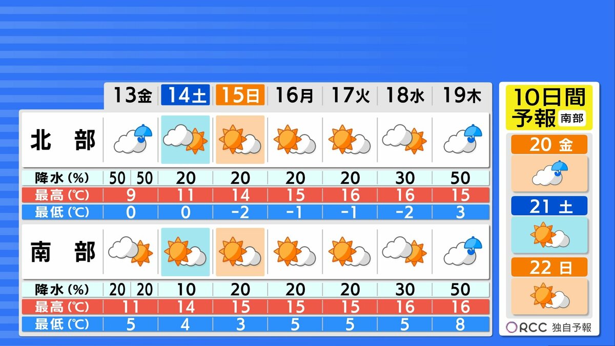 あさって以降来週水曜日頃にかけておおむね晴れて日差しが暖かいでしょう。日中の気温は平年並からやや高い日が多く、この時期らし春の陽気になるでしょう。北部や内陸部を中心に一日の寒暖差がかなり大きくなるため体調管理にはご注意ください。