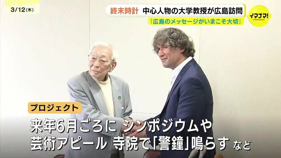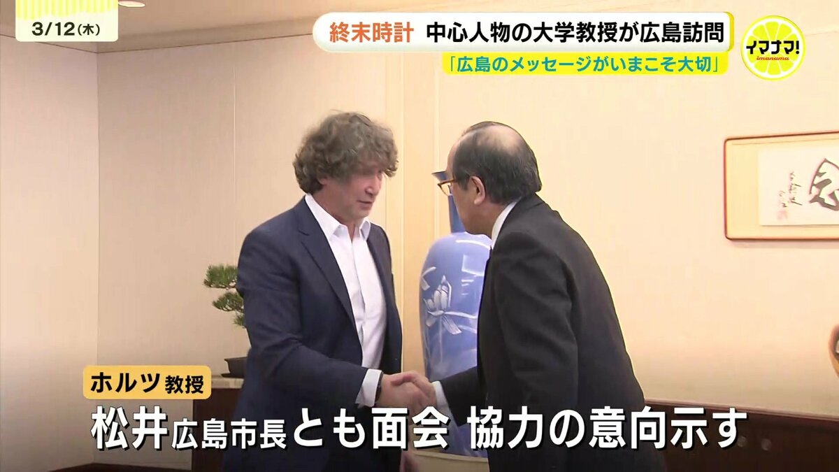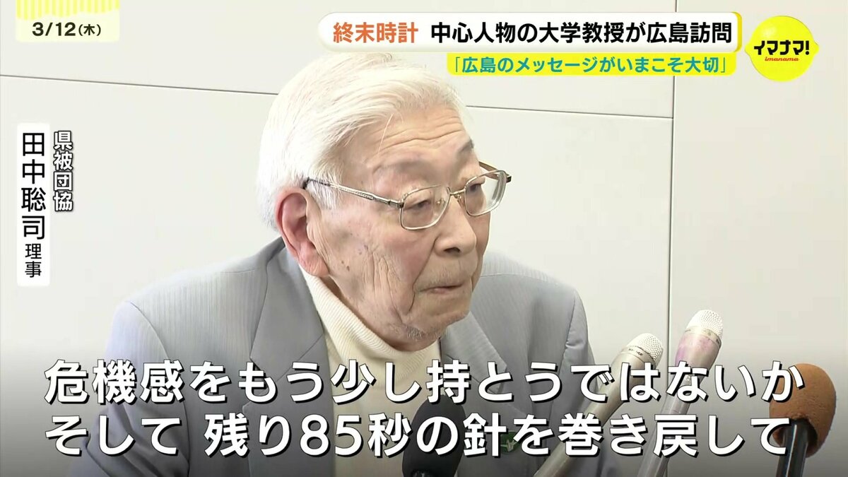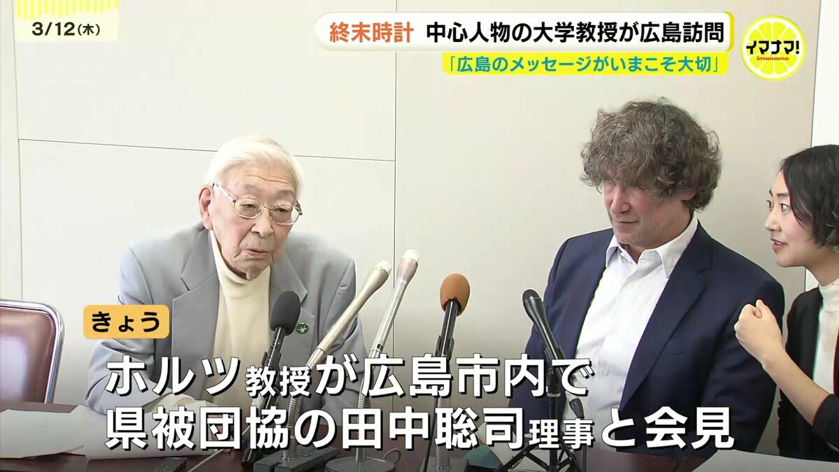 この時刻を決める委員会の議長を務めるホルツ教授が、12日、広島市内で、広島県被団協の田中聡司理事と会見を開きました。終末時計の誕生から80年を迎える来年、広島を中心に「針を引き戻す取り組み」を行うと明らかにしました。