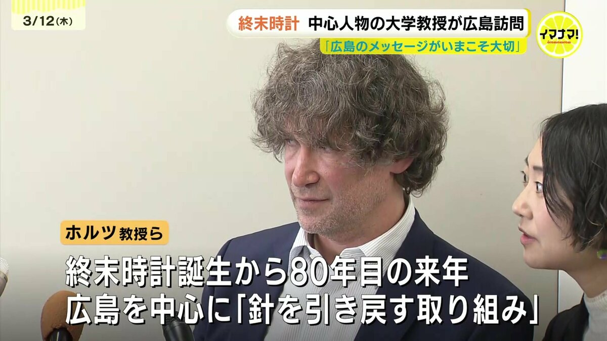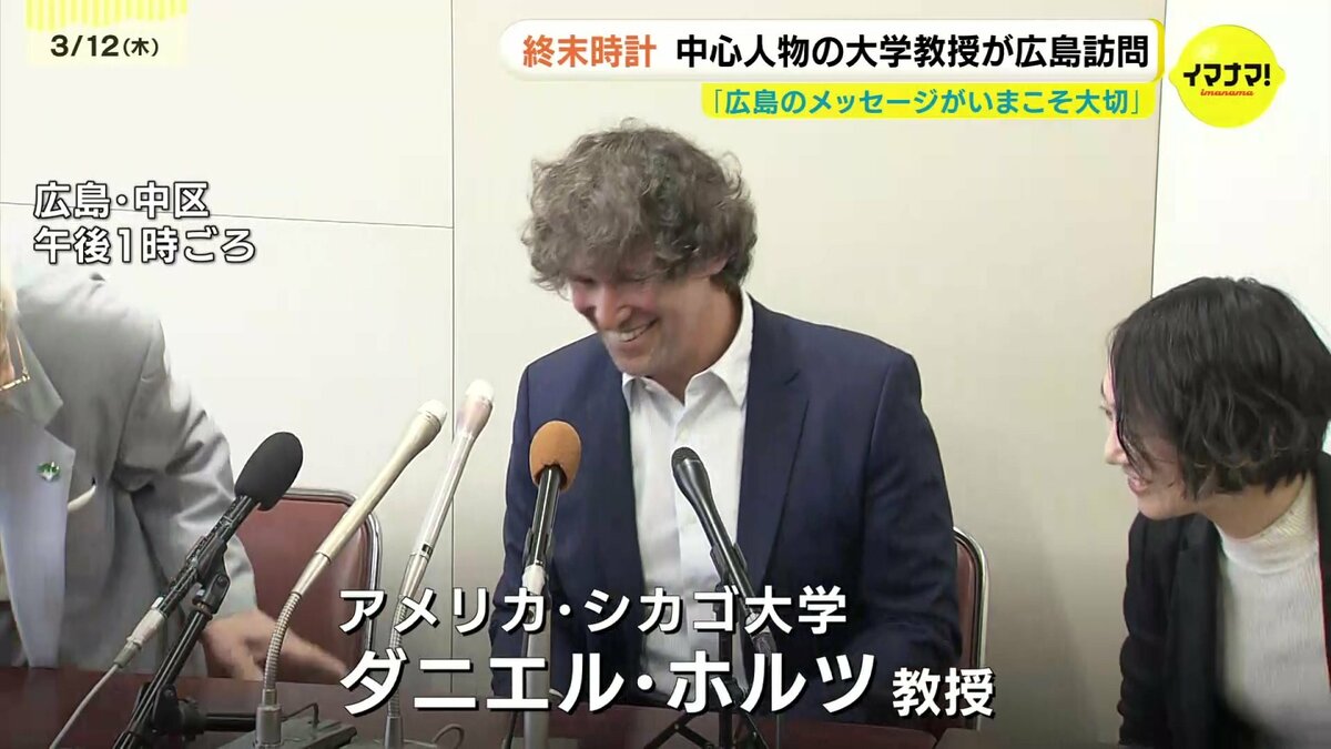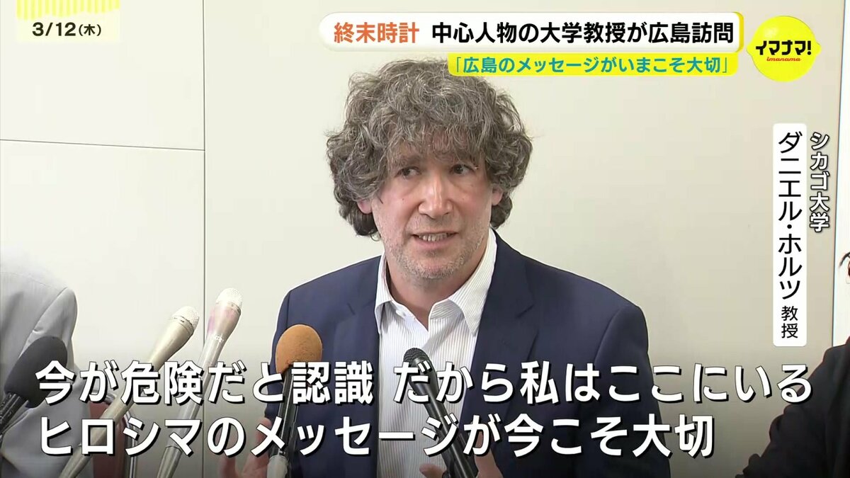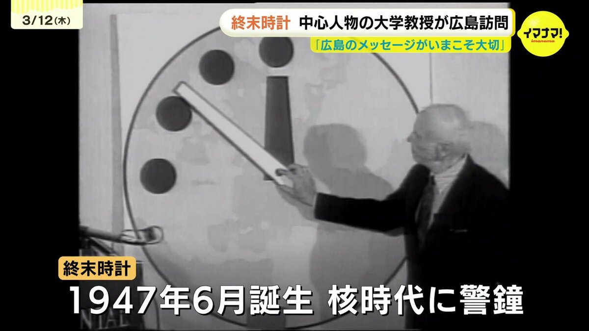 広島市を訪れたのは、アメリカ・シカゴ大学のダニエル・ホルツ教授です。終末時計は原爆投下から2年後の1947年6月27日に、核の時代に警鐘を鳴らす象徴として誕生しました。人類滅亡を示す「真夜中」まで「残り7分」の状態でスタートした時計の針は、現在「残り85秒」まで進んでいます。