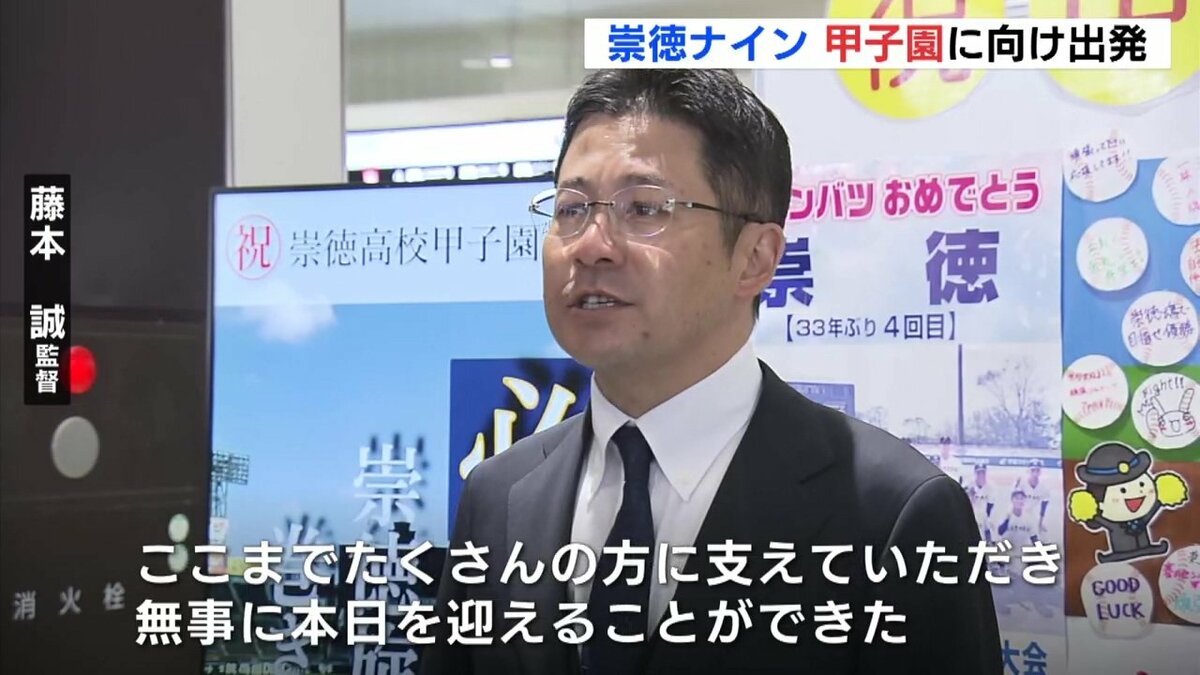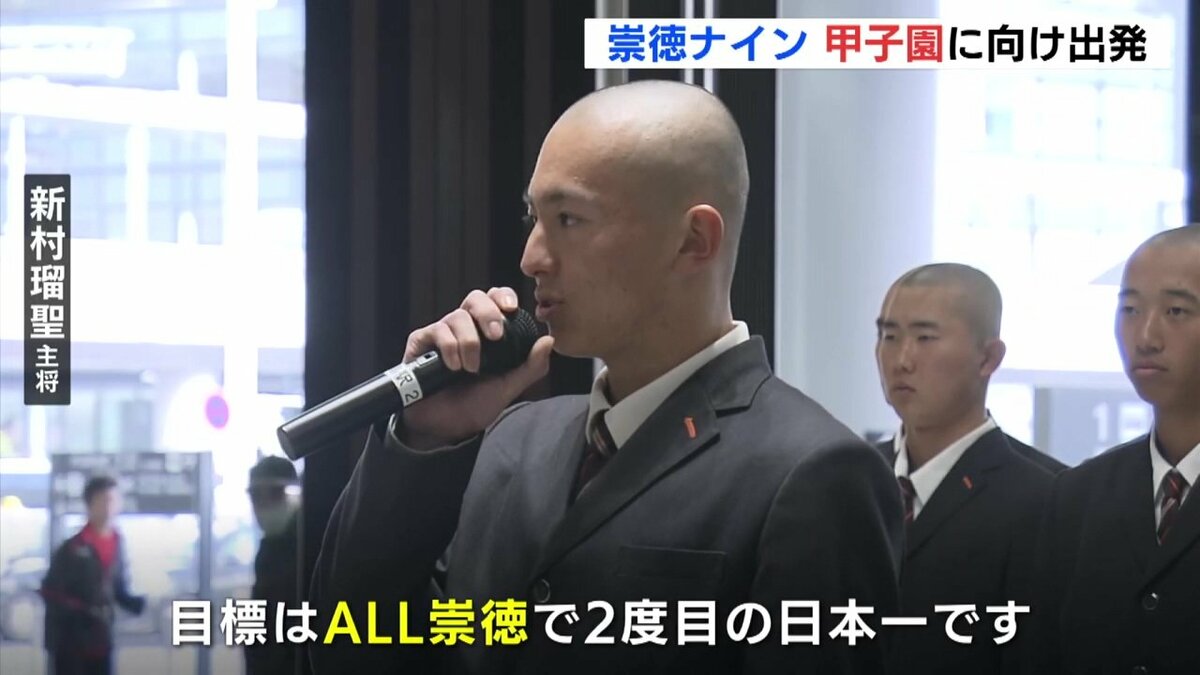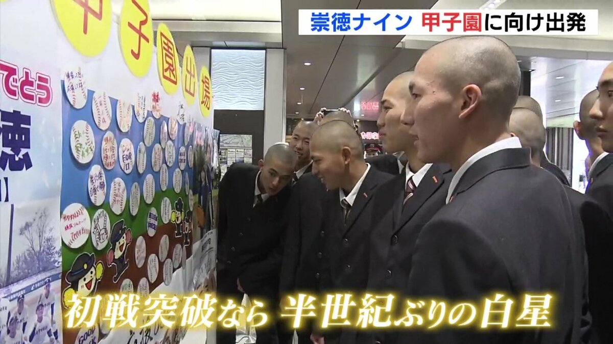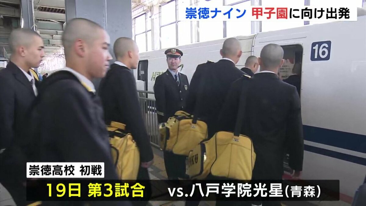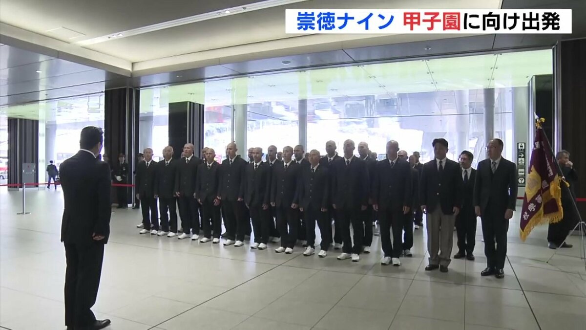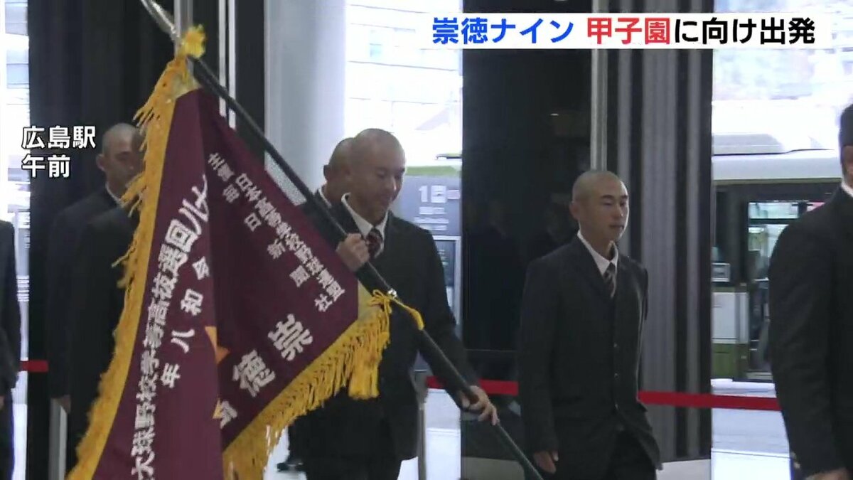 春のセンバツ高校野球に出場する崇徳高校の選手たちが、13日、甲子園に向けて出発しました。