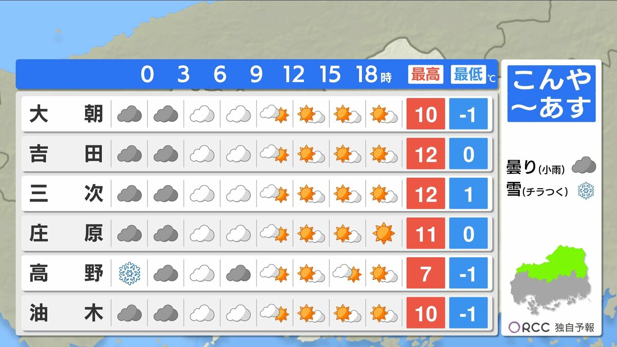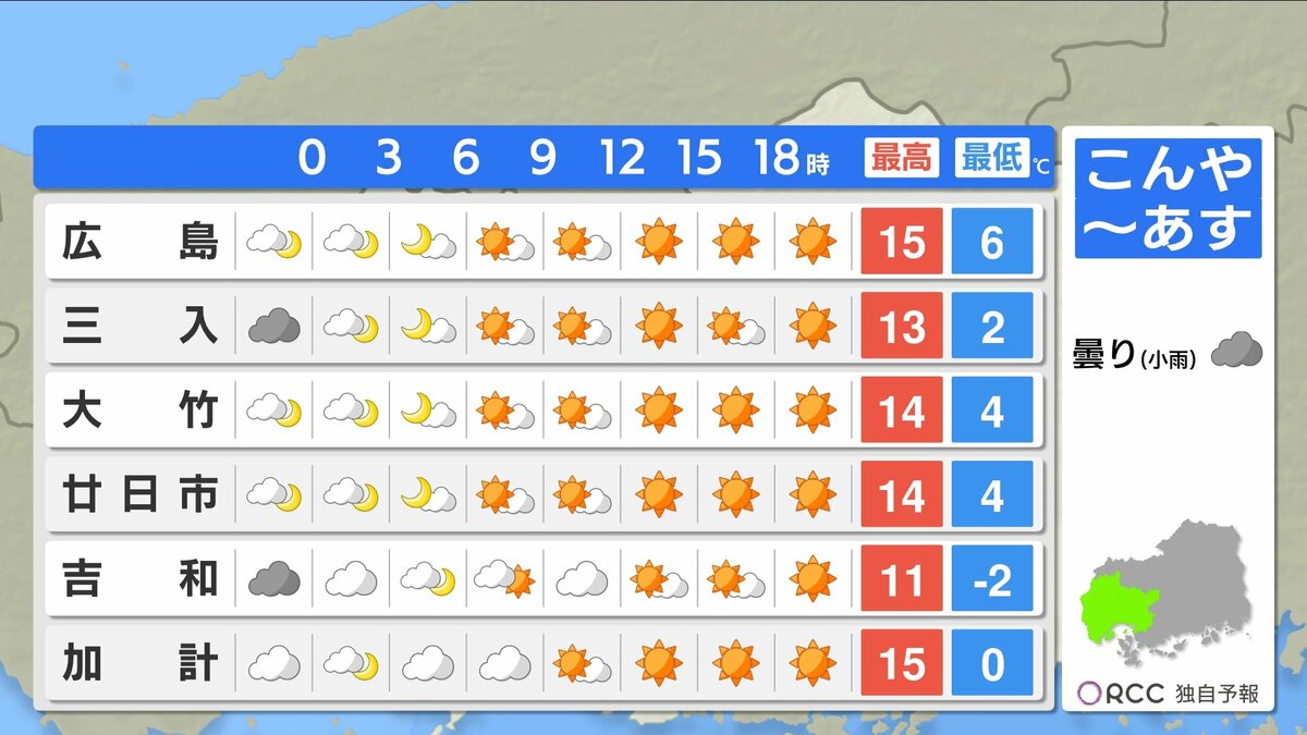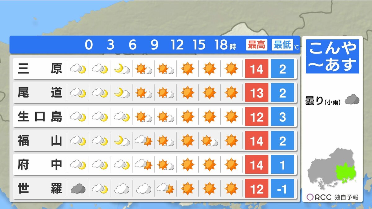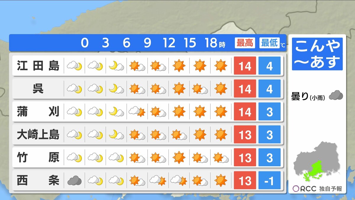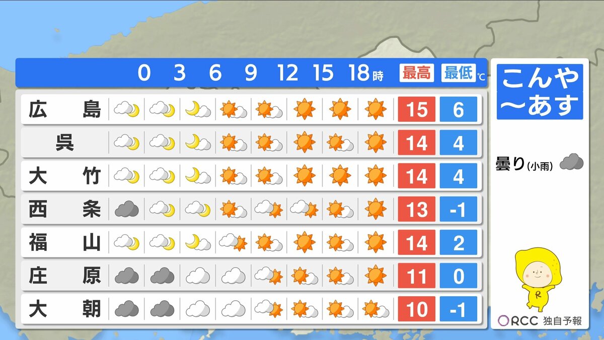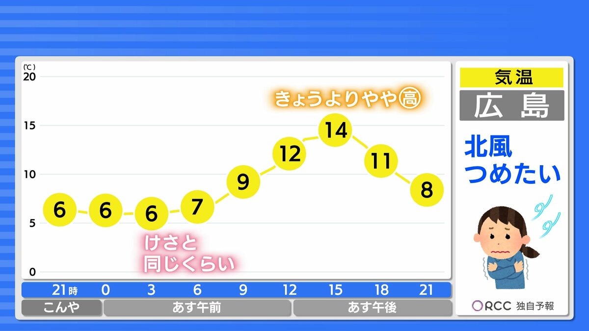 きょう13日(金)の広島県内は、日差しがあっても北風が強く、寒い1日になりました。広島では最大瞬間風速が21.5m/s。最高気温は、沿岸部で12℃台、北部・内陸部で10℃を下回ったところが多くなりました。