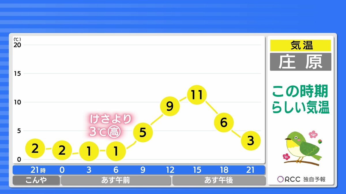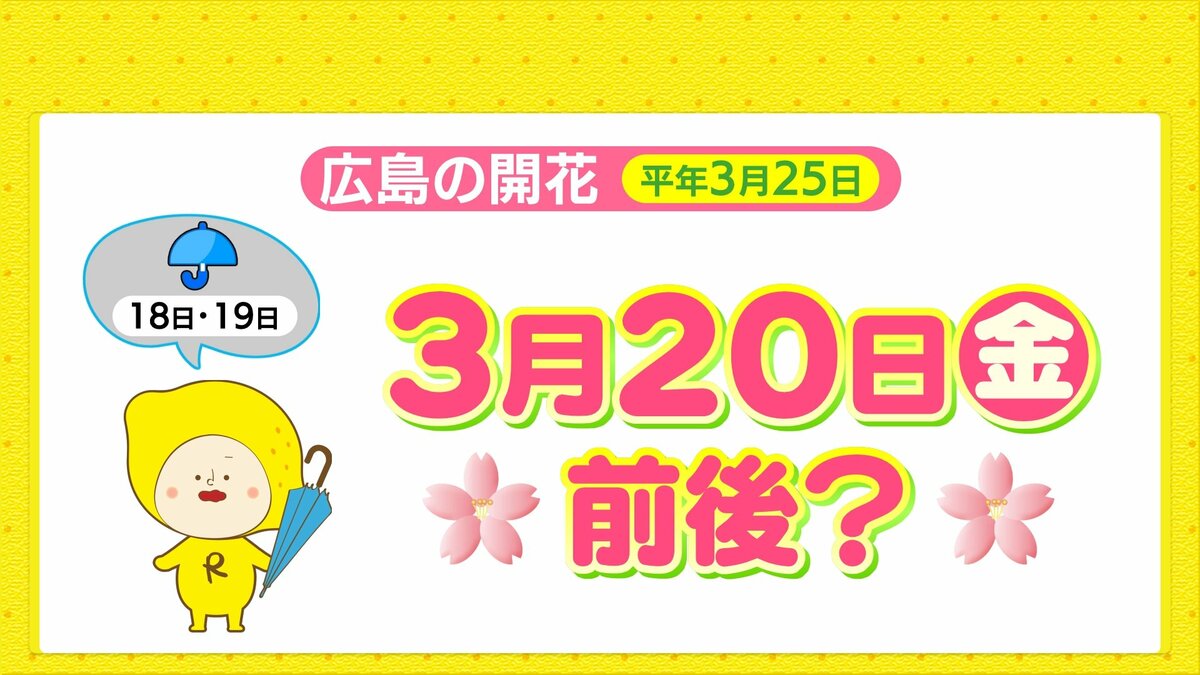 穏やかな天気は17日(火)まで続き、春陽気となるでしょう。18日(水)と19日(木)は雨が降る見込みです。広島のサクラの開花発表は、平年は25日ですが、今年は早く、20日(金)前後となりそうです。本格的な春はもうすぐやってきます。