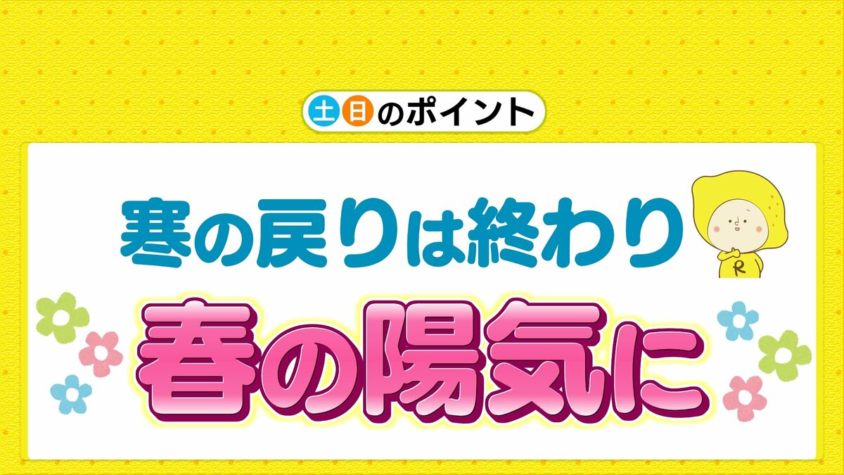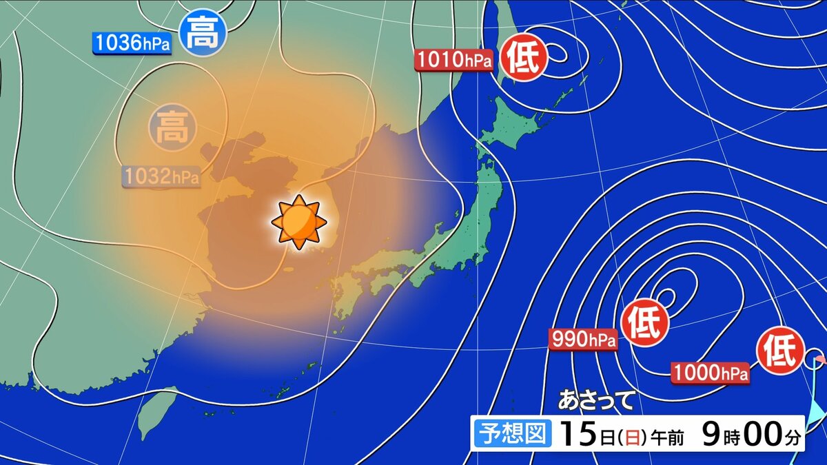 あさって15日(日)は、大陸からの高気圧が張り出し、穏やかに晴れる見込みです。風も弱まるでしょう。気温は、各地15℃前後となり、日差しのもとでは暖かい予想です。スギ花粉がピークとなっています。この週末も十分な対策をしてお過ごしください。