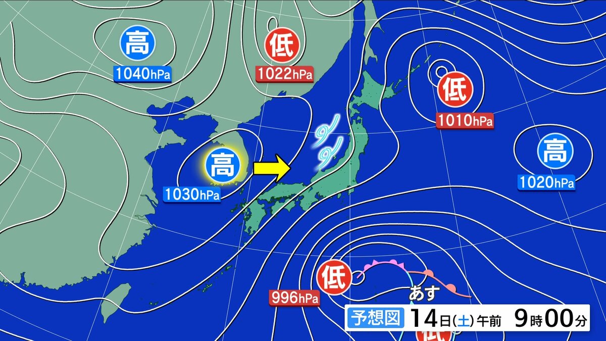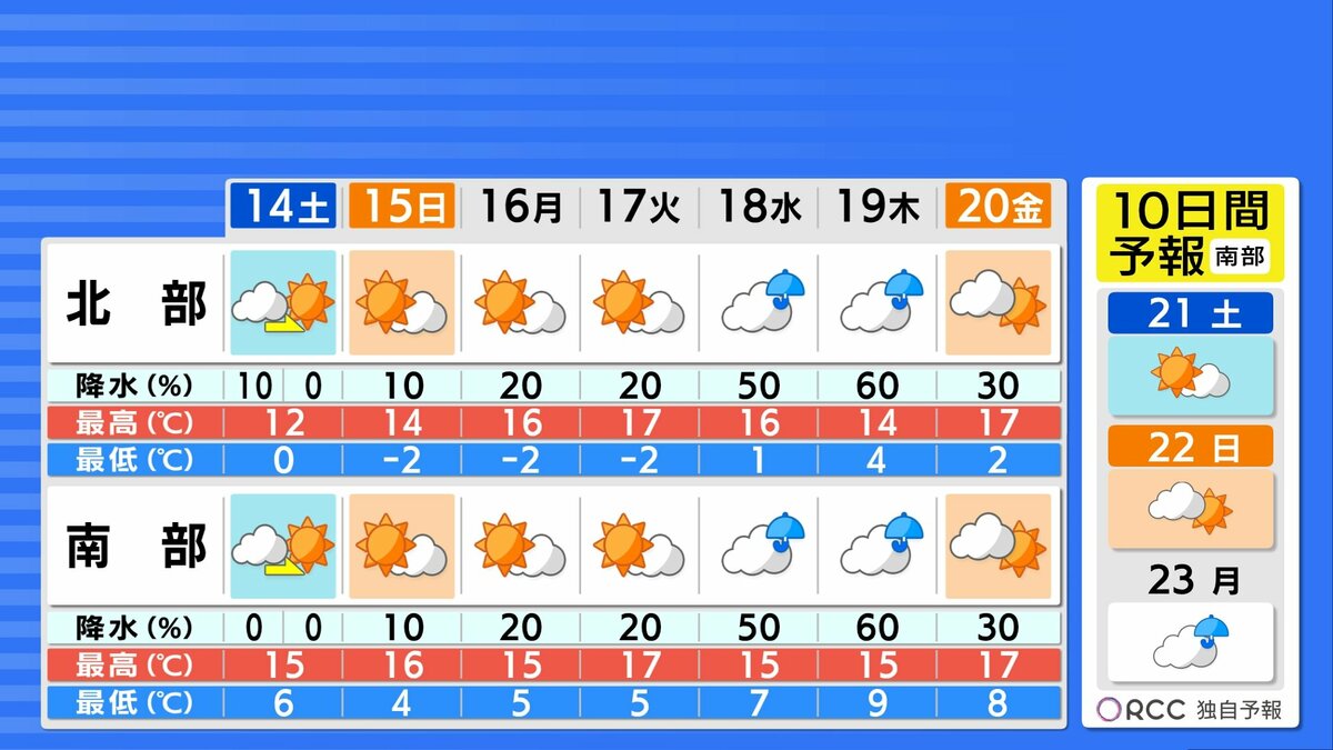 14日(土)は、引き続き北風が強いですが、天気の大きな崩れはない見込みです。北部では朝の内、雲が多いものの、昼前には晴れ間も広がるでしょう。日差しがあっても風が冷たいので、防寒対策が必要です。最高気温は、13日(金)よりも3℃くらい高い予想です。