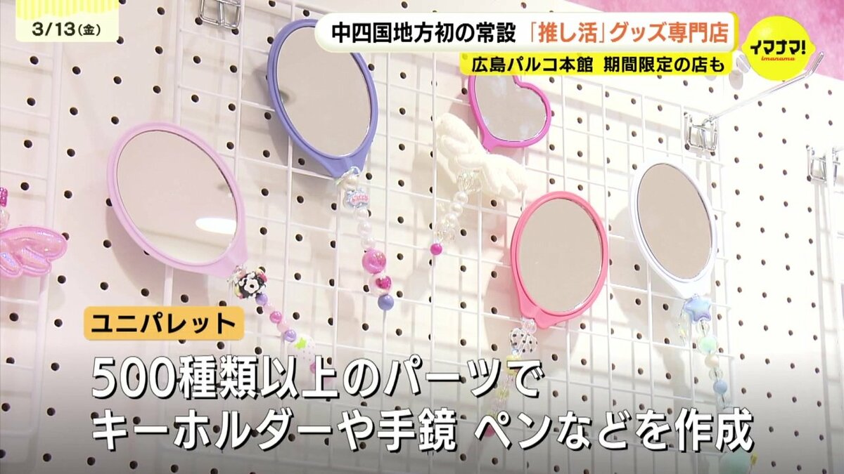 他にもオリジナルの推しグッズを作ることができる店があります。3日に期間限定でオープンした「ユニパレット」です。500種類以上のカスタムパーツを組み合わせて、オリジナルのキーホルダーや手鏡、ペンなどを作ることができます。