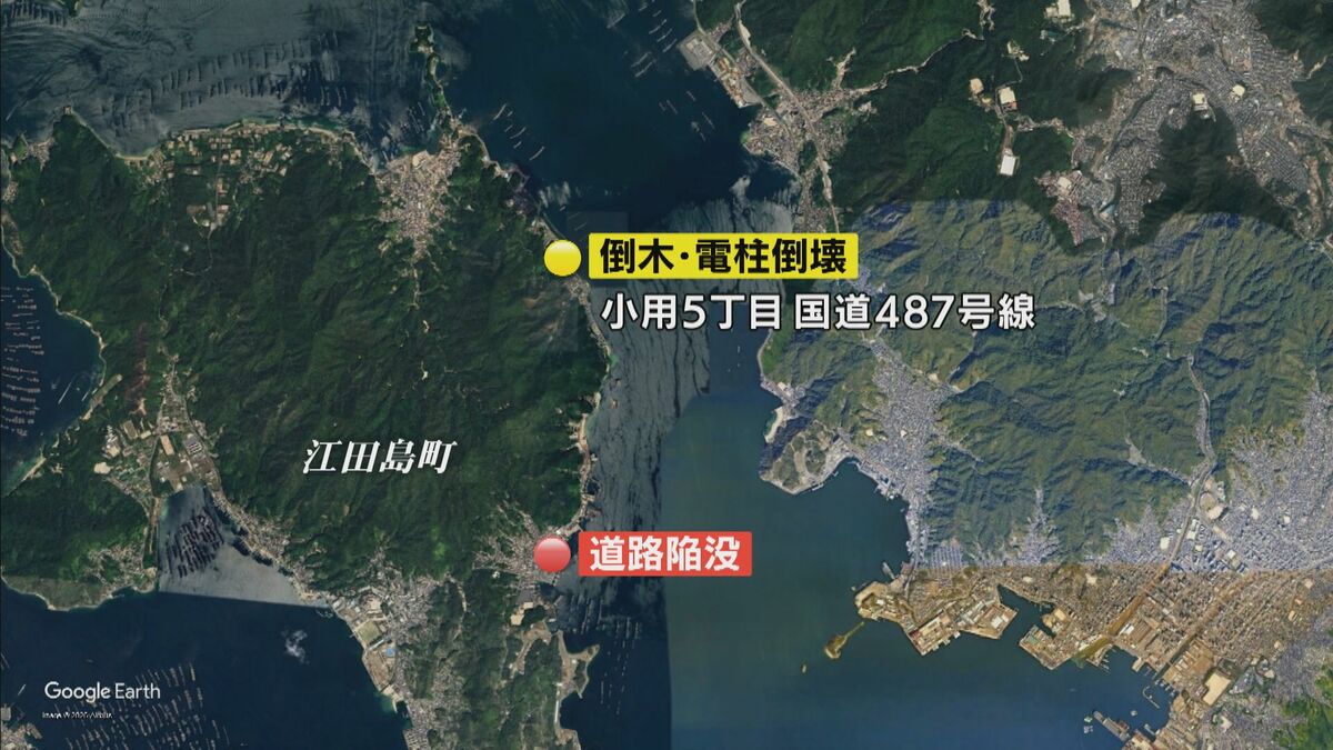 広島県江田島市で14日、道路が陥没し、送水管の復旧工事が行われています。また4kmほど離れた場所では国道沿いの木と電柱が倒れ、通行止めとなっています。