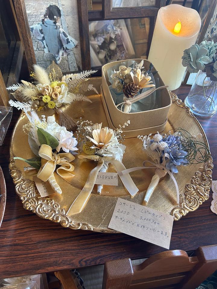 そしてこの季節、人気なのがドライフラワーのコサージュ。