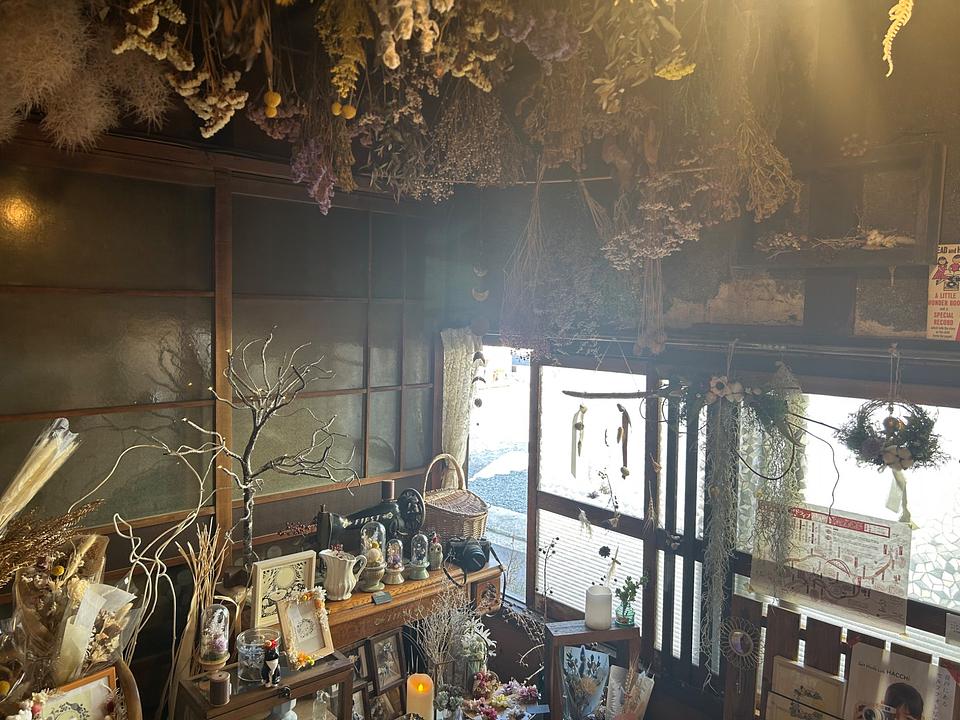 扉を開けると、天井からたくさんのドライフラワーがふわっと下がり、店内には足踏みミシンなど昭和レトロな家具も並んでいます。