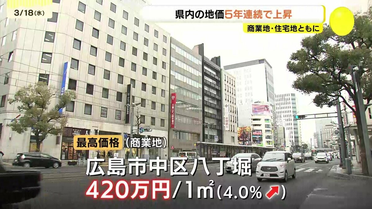 最も地価が高かったのは商業地が、広島市中区の八丁堀で、1平方メートルあたり420万円でした。住宅地は中区中町で1平方メートルあたり179万円となりました。