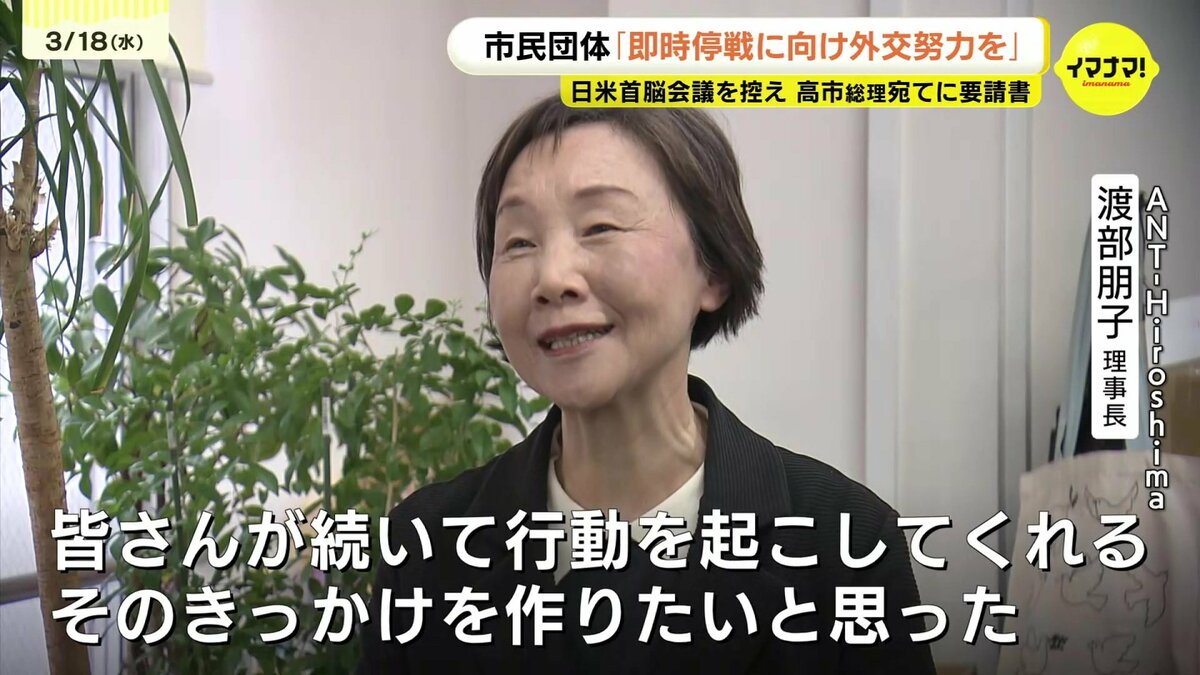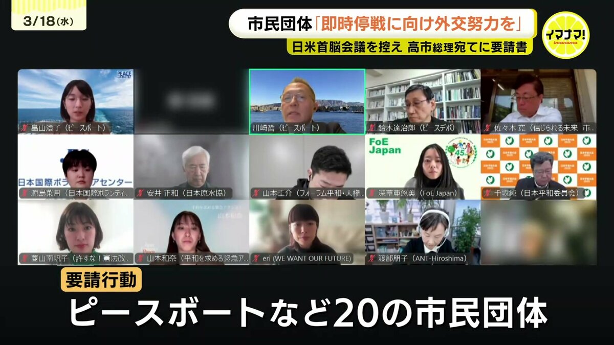 中東情勢が緊迫する中、緊急で要請行動を決めたのは、ピースボートなど20の市民団体です。高市首相にあてて、19日の首脳会談でアメリカのトランプ大統領に働きかけて欲しいとして、「国際法の遵守と即時停戦」など4項目を要請する文書を送ったということです。