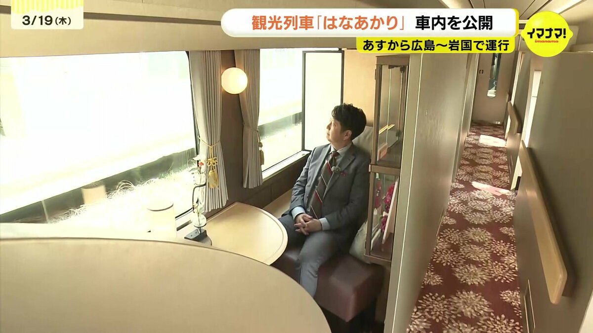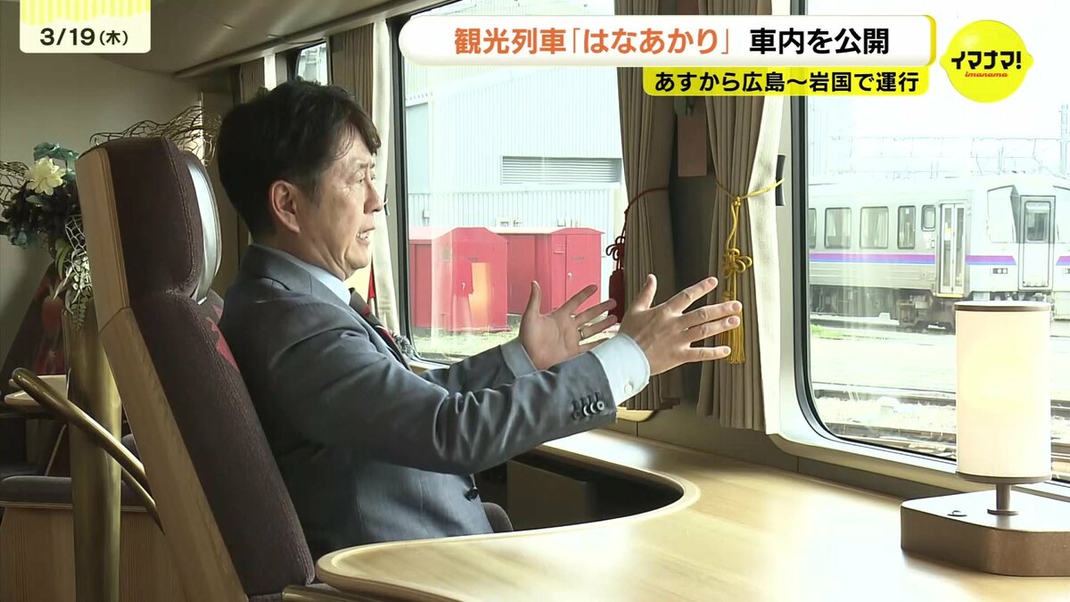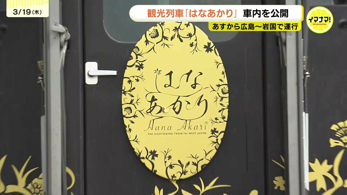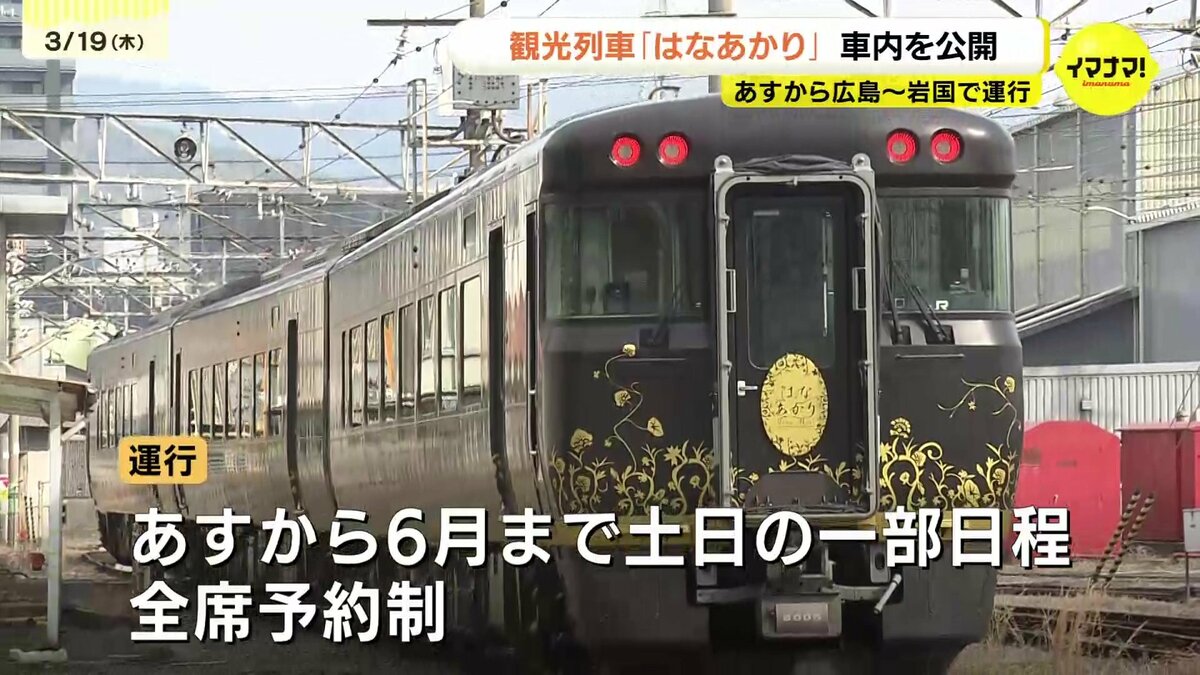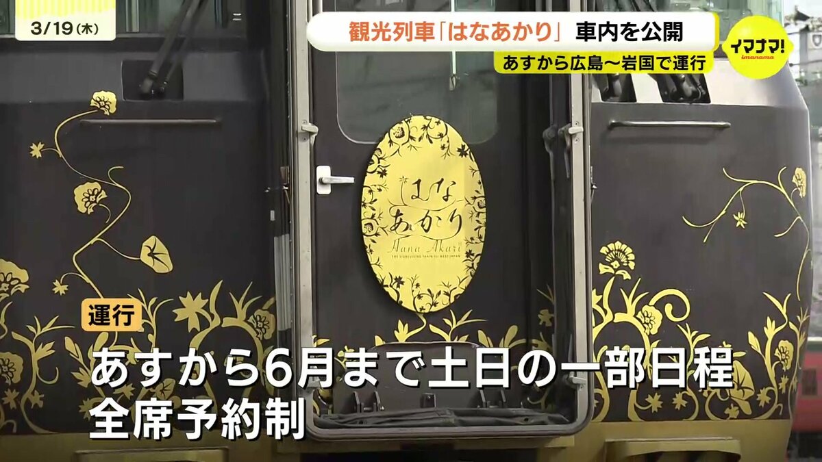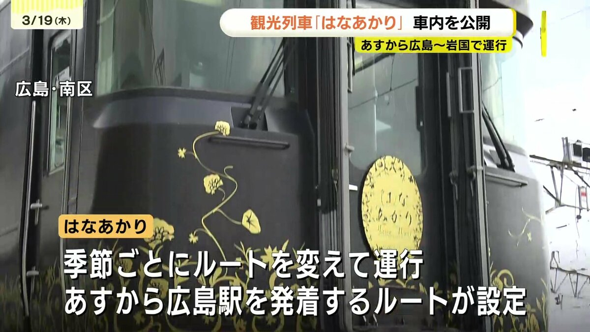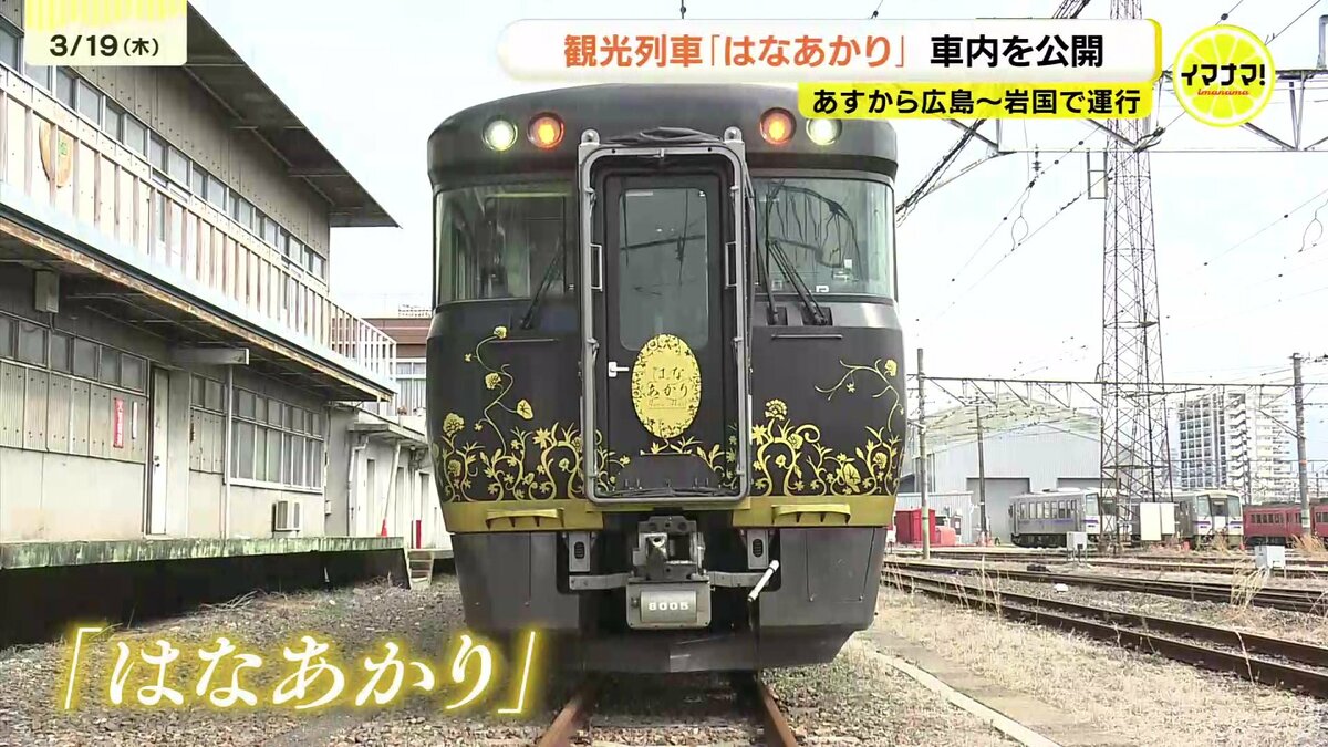 JR西日本の観光列車「はなあかり」があすから広島・岩国間で運行します。運行開始を前に車内が公開されました。