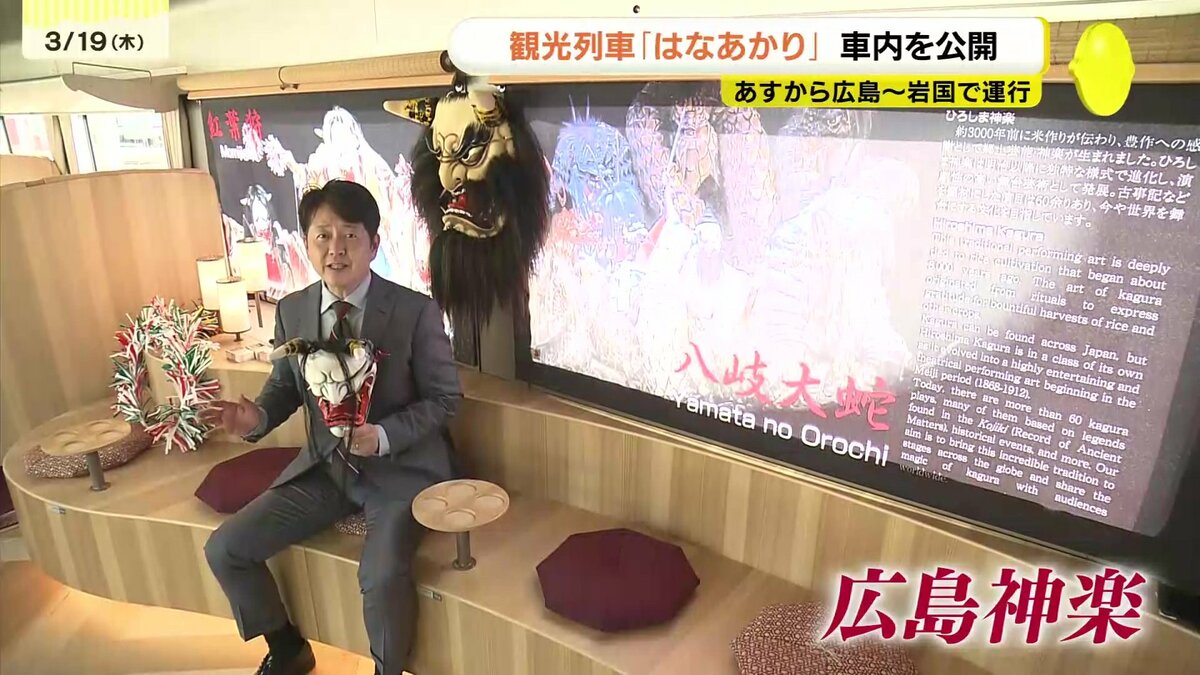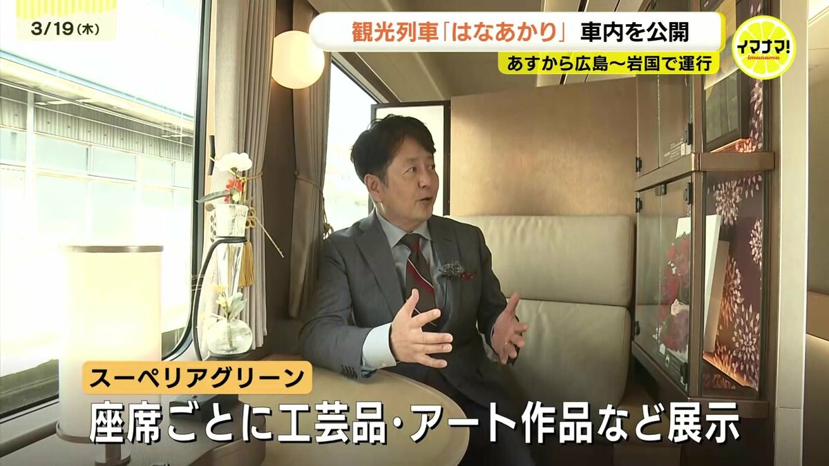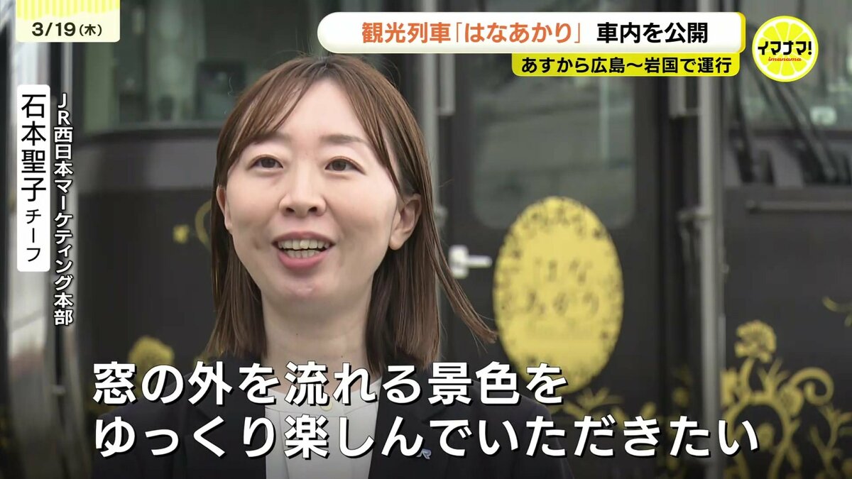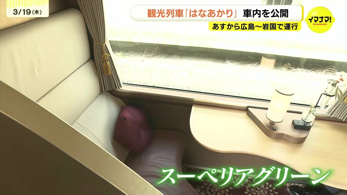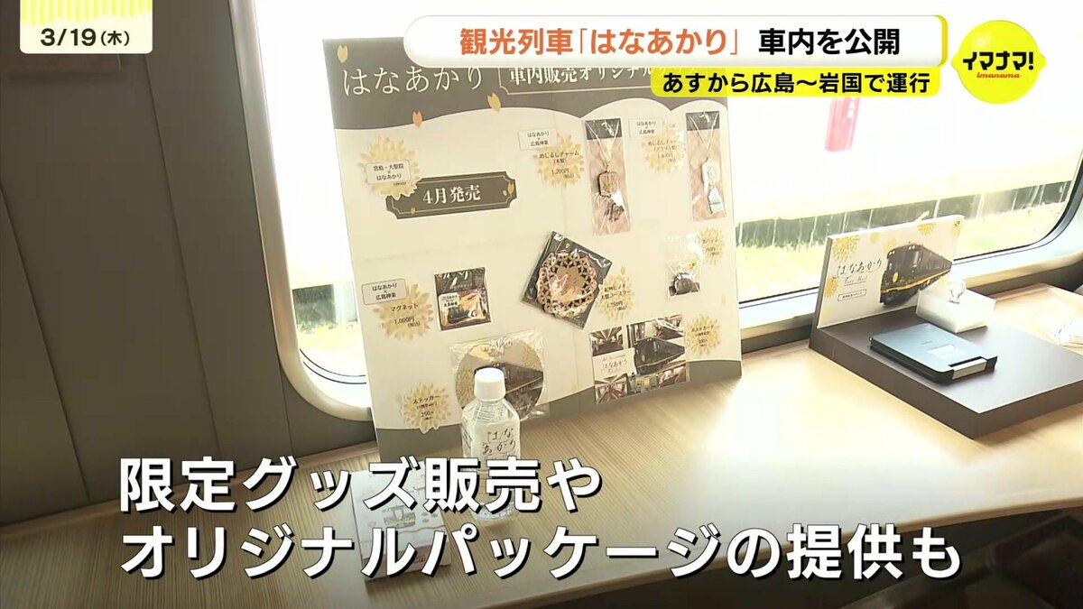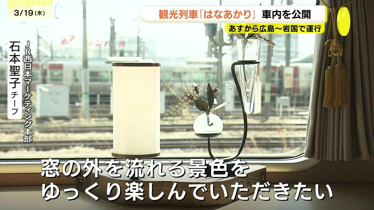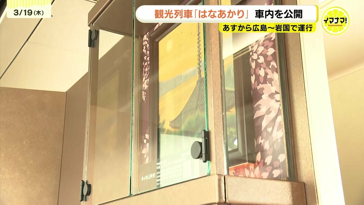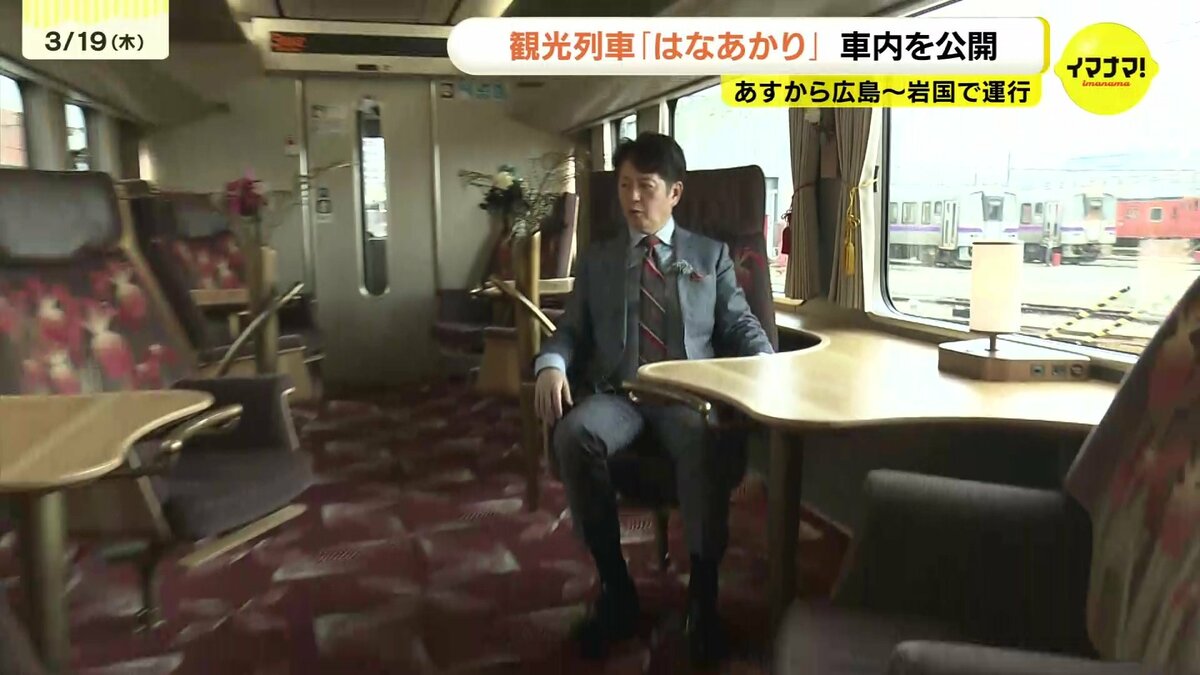 JR西日本の観光列車「はなあかり」があすから広島・岩国間で運行します。運行開始を前に車内が公開されました。