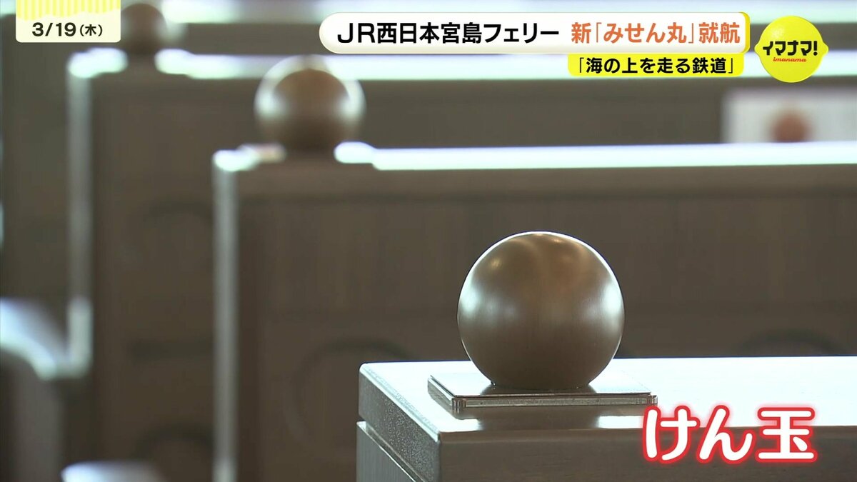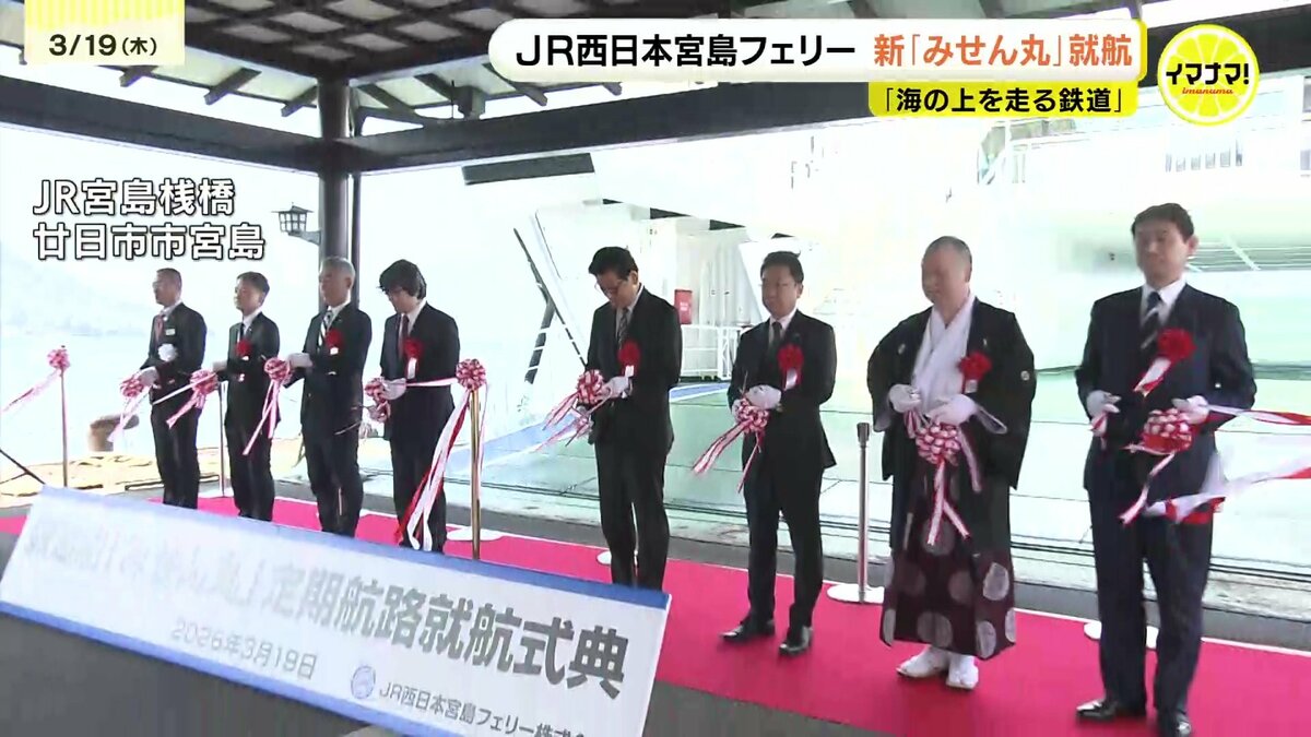 19日、宮島桟橋で行われた「みせん丸」の就航式。新しい「みせん丸」は、1996年から、多くの観光客を運んできた旧「みせん丸」の老朽化に伴い、導入されました。厳島神社の鳥居をイメージした朱色と白の伝統的なカラーは引き継いでいますが、船内には驚きの進化が隠されていました。