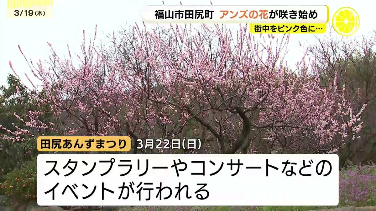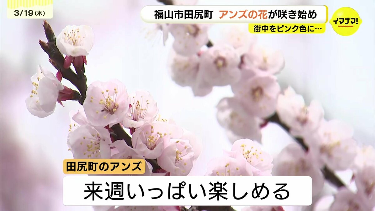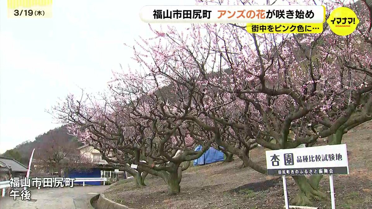 福山市田尻町ではアンズの花が3分咲きとなりました。その歴史はおよそ340年前。大分から移住してきた寺の住職が境内にアンズの種を植えたのが始まりとされています。今では「アンズの里」として親しまれ、町中に植えられたおよそ3000本がこの時期、一斉に花を咲かせます。