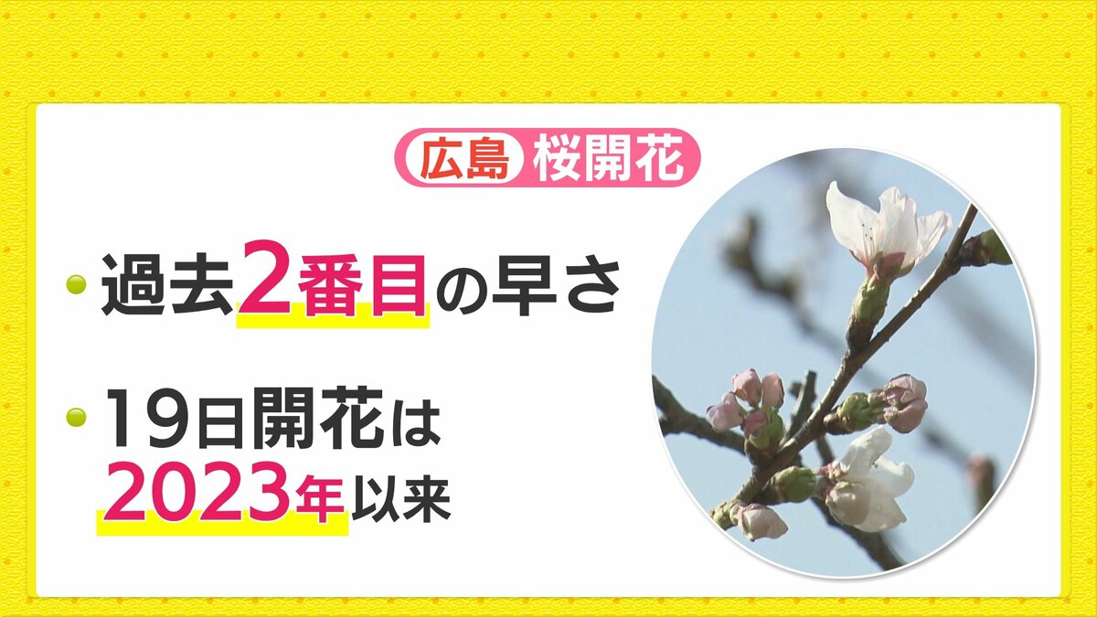 広島ではきょう(3月19日)桜の開花発表がありました。平年より6日早く、過去2番目に早い発表となりました。3月19日に発表があったのは、過去には2023年3月19日で、2023年以来の発表となっています。