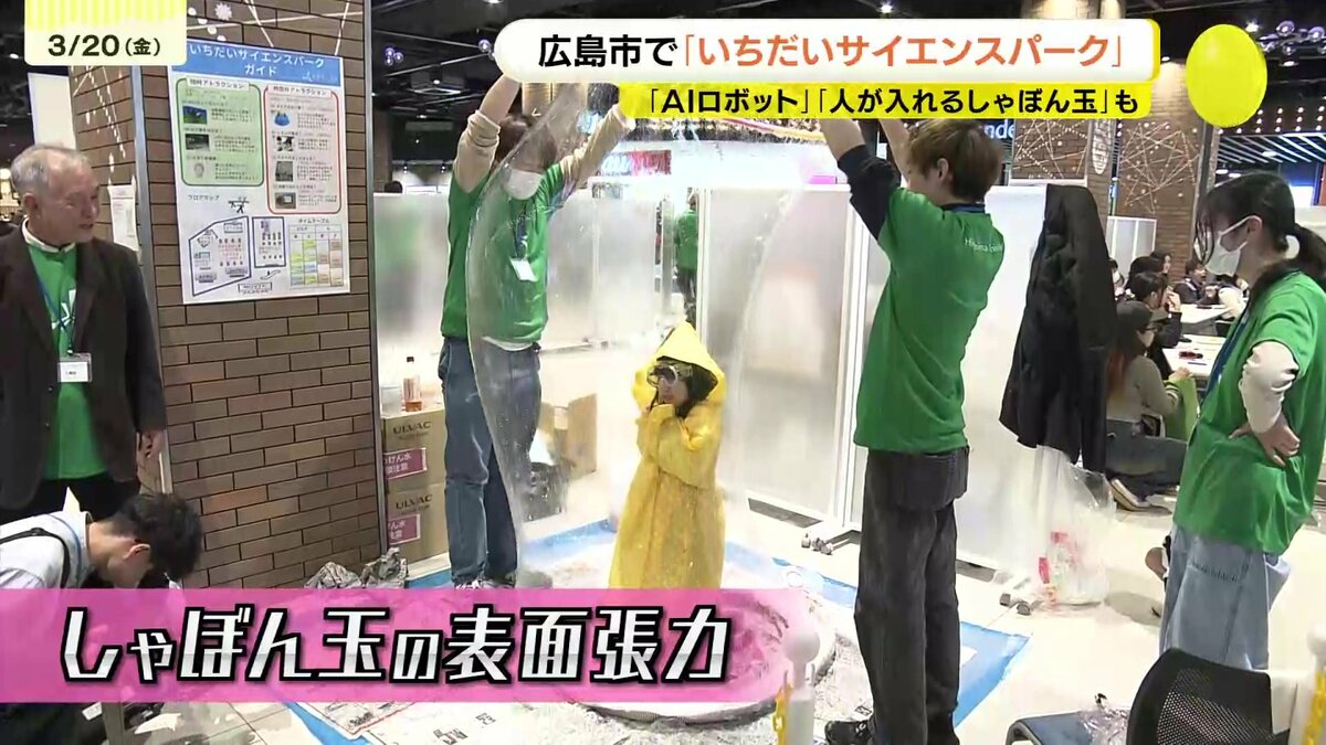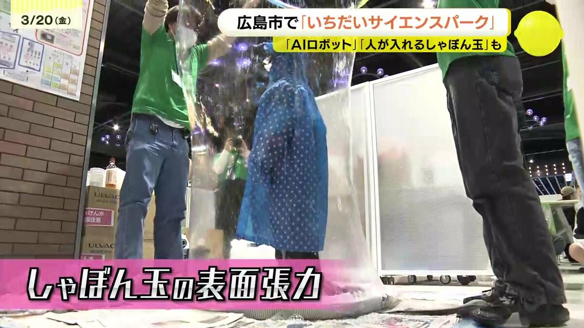 ブースではAIロボットを実際に操作し、AIがどのように情報を集めているのかを学びます。シャボンに入る人が中に入れるほど大きなしゃぼん玉。液体の「表面張力」を身近な形で観察することができます。