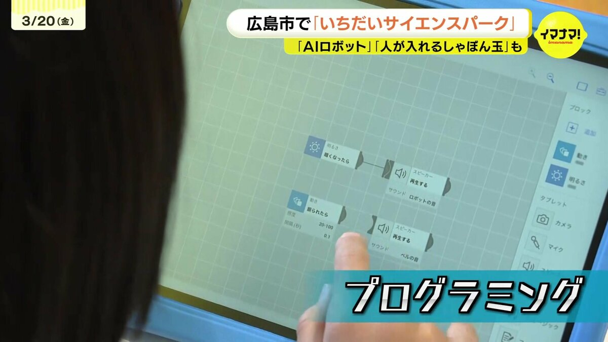 またタブレットを使ったプログラミングのコーナーでは日用品にセンサーを貼り付けて便利な機能を持たせることを体験していました。