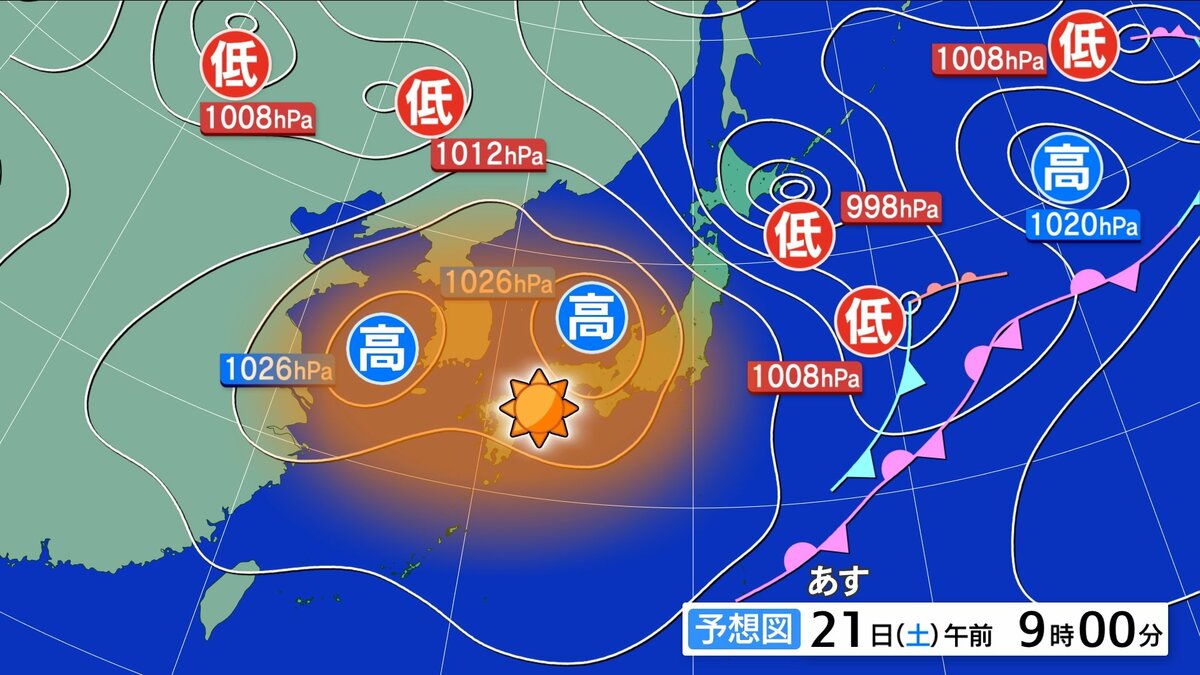 21日(土)高気圧に覆われてよく晴れる お出かけ日和に