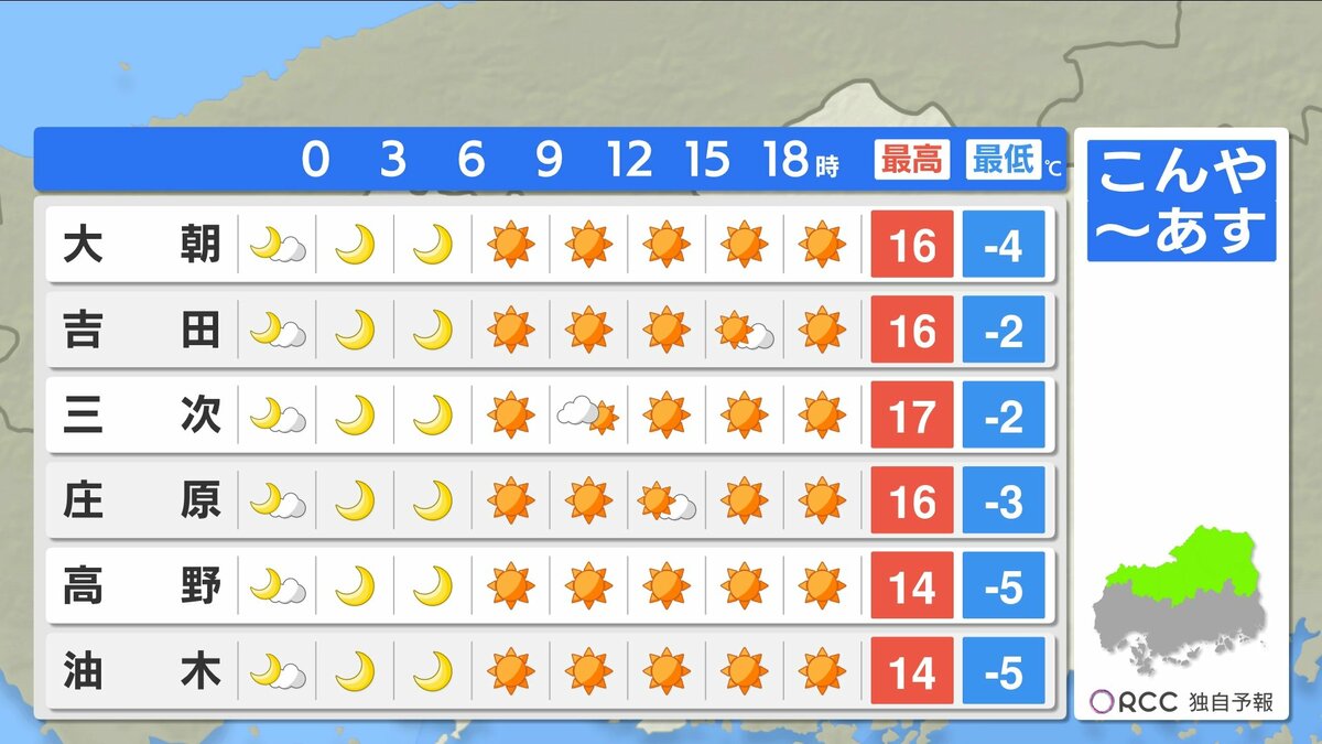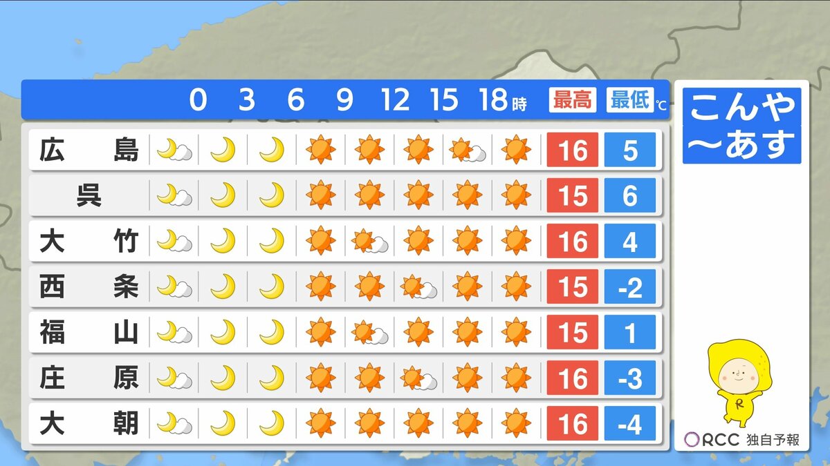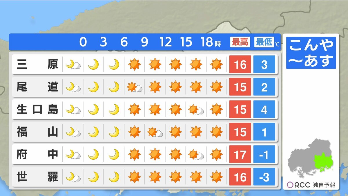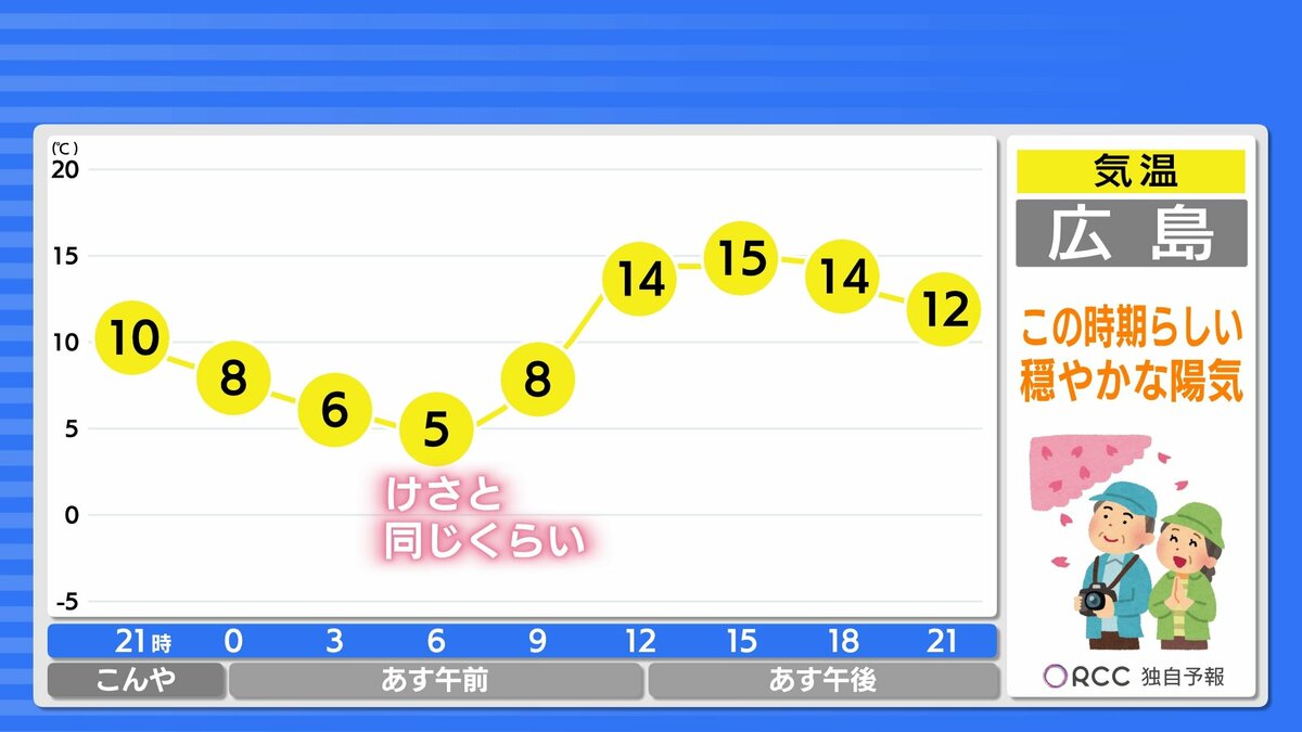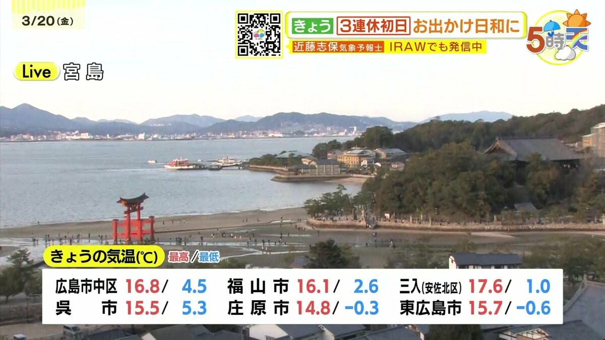きょう20日(金)の広島県内は、1日穏やかに晴れました。最高気温は、広島市安佐北区三入で17.6℃、広島市中区で16.8℃、三次市で15.3℃、各地で春の陽気となっています。