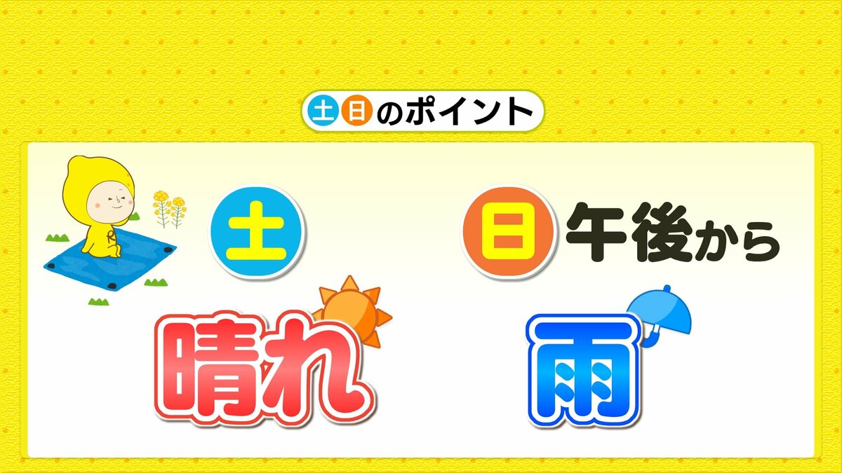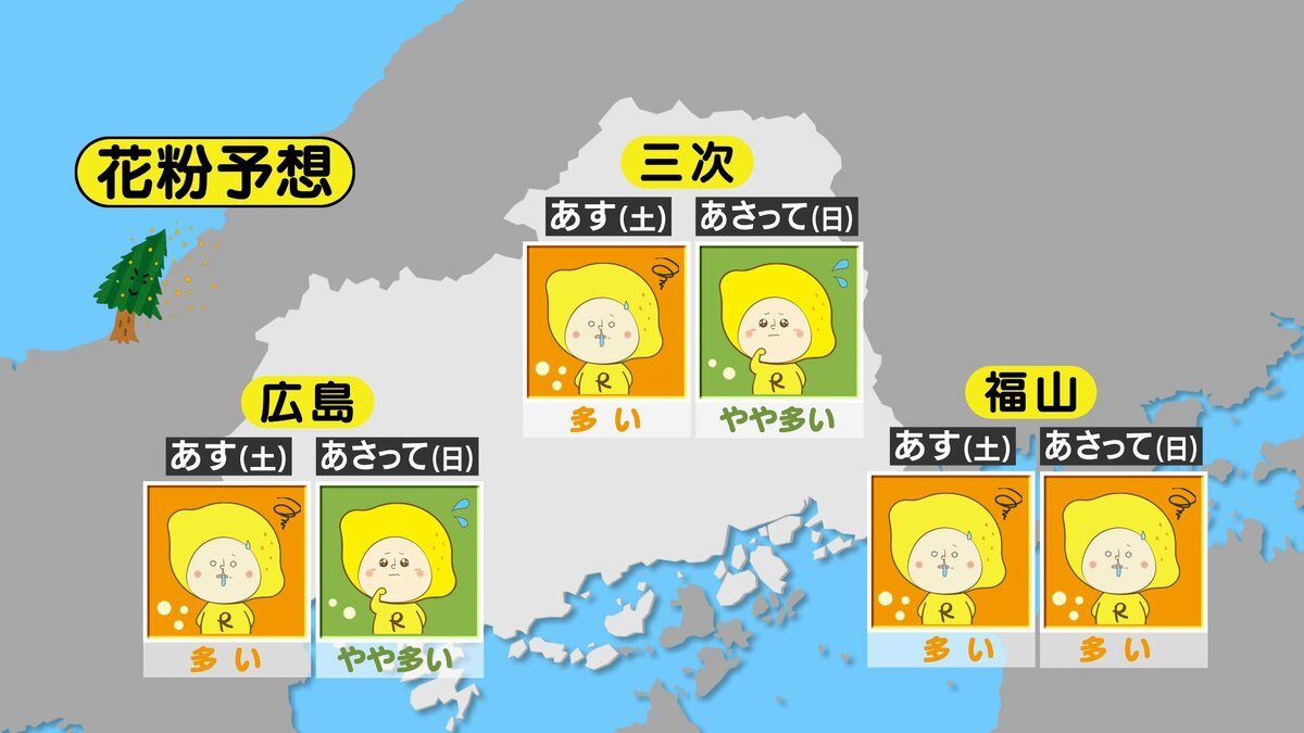 22日(日)午後からの雨は23日(月)の朝にはやむ見込みです。来週は、日本の南に前線が停滞し、広島県内でも雲が広がりやすいでしょう。雨が降ったりくもったり、雨が降る日もありそうです。花粉は、スギがピークを過ぎ、収束してきています。来週からはヒノキが本格飛散となる予想です。花粉症の人は対策をしてお過ごしください。