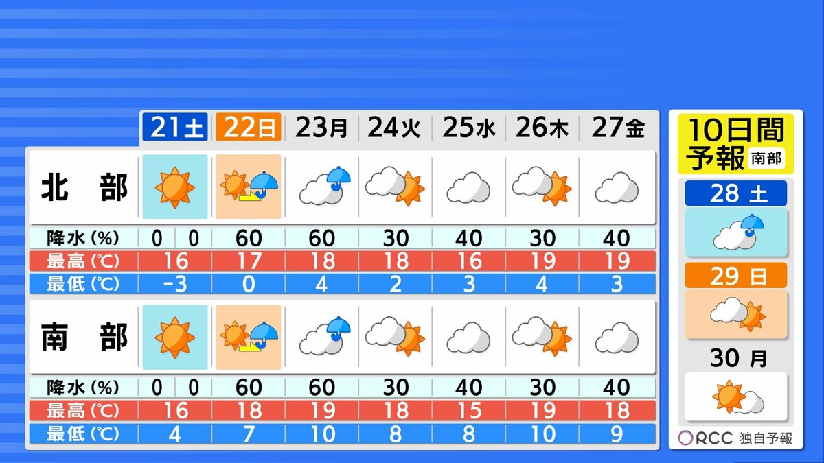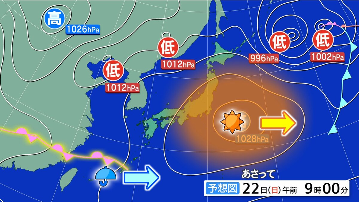あさって22日(日)は、高気圧は東へ進み、西からは前線や低気圧が近付く見込みです。そのため、午前中は日差しが届きますが、午後からは天気下り坂でしょう。夜には雨脚が強まる時間がありそうです。