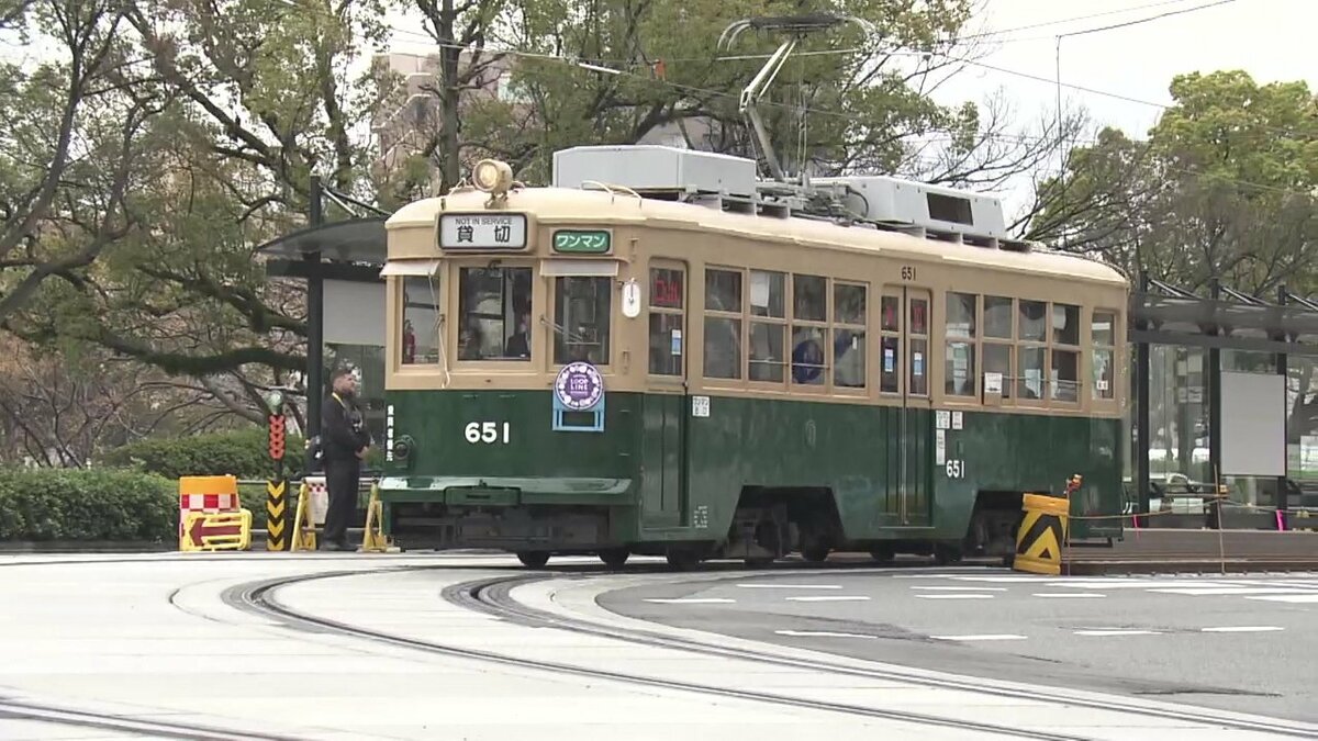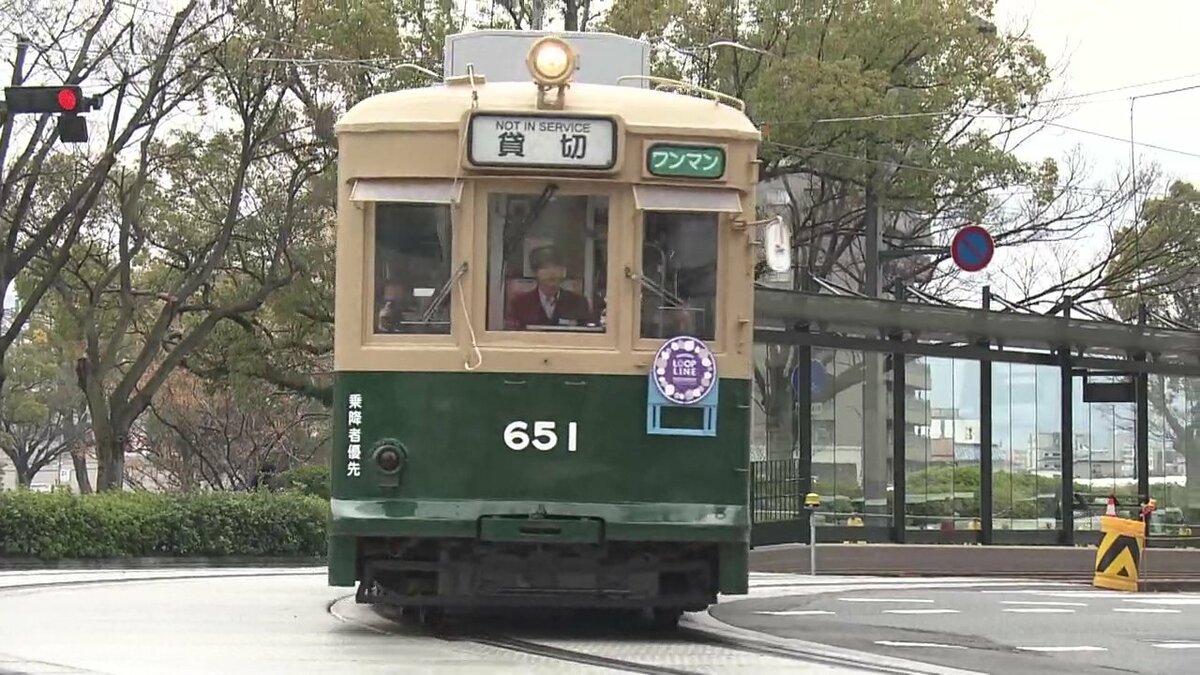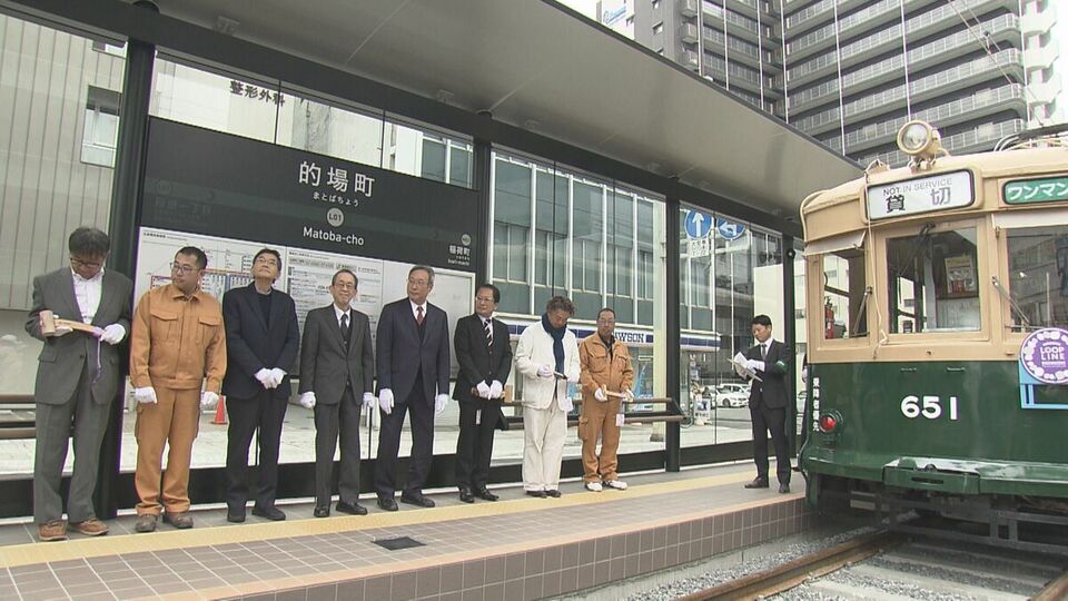 かつて停留場にあったタイルと新たにデザインされたタイルが、床面に埋め込まれました。的場町周辺は、駅前大橋ルートの開通に伴い廃止予定でしたが、住民の存続要望を受け、23年ぶりに新系統「循環線」として開業します。