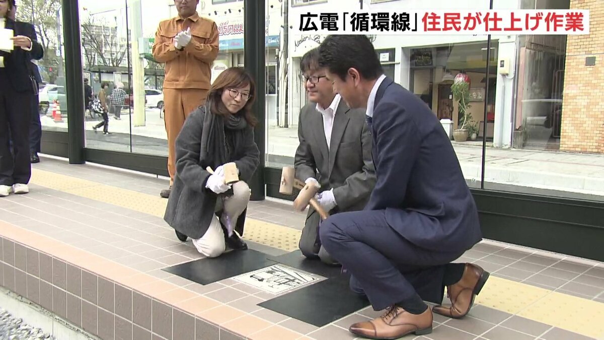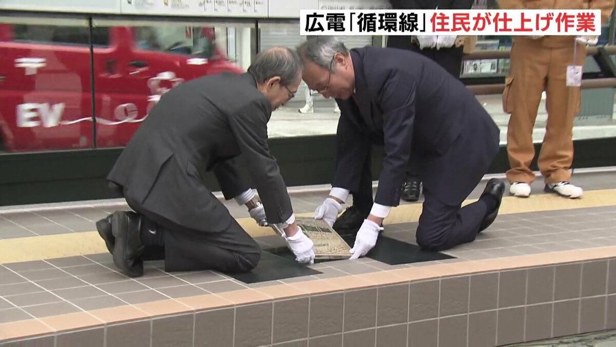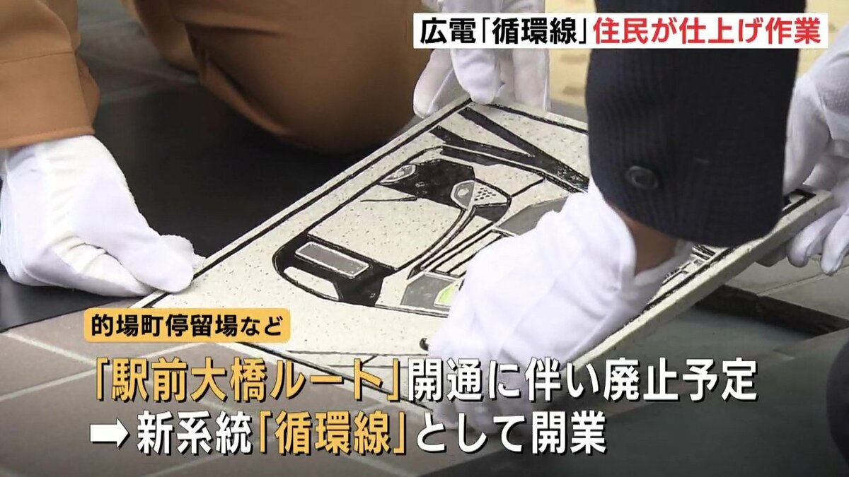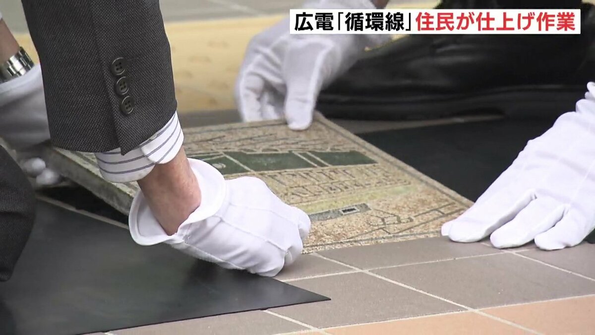 広島市の中心部を周回する「循環線」開業を1週間後に控え、的場町の住民が貸切電車で新ルートを一足先に体験しました。住民たちは、停留場で仕上げ作業の「レリーフタイル」を設置しました。