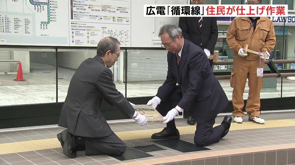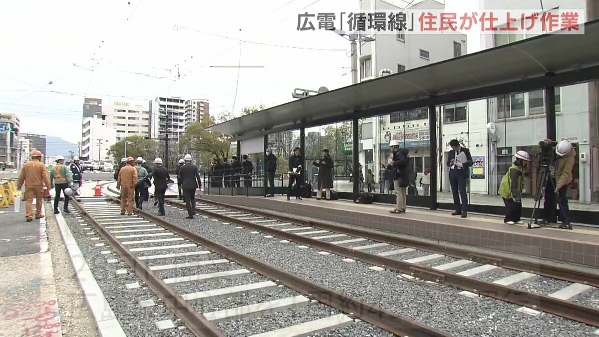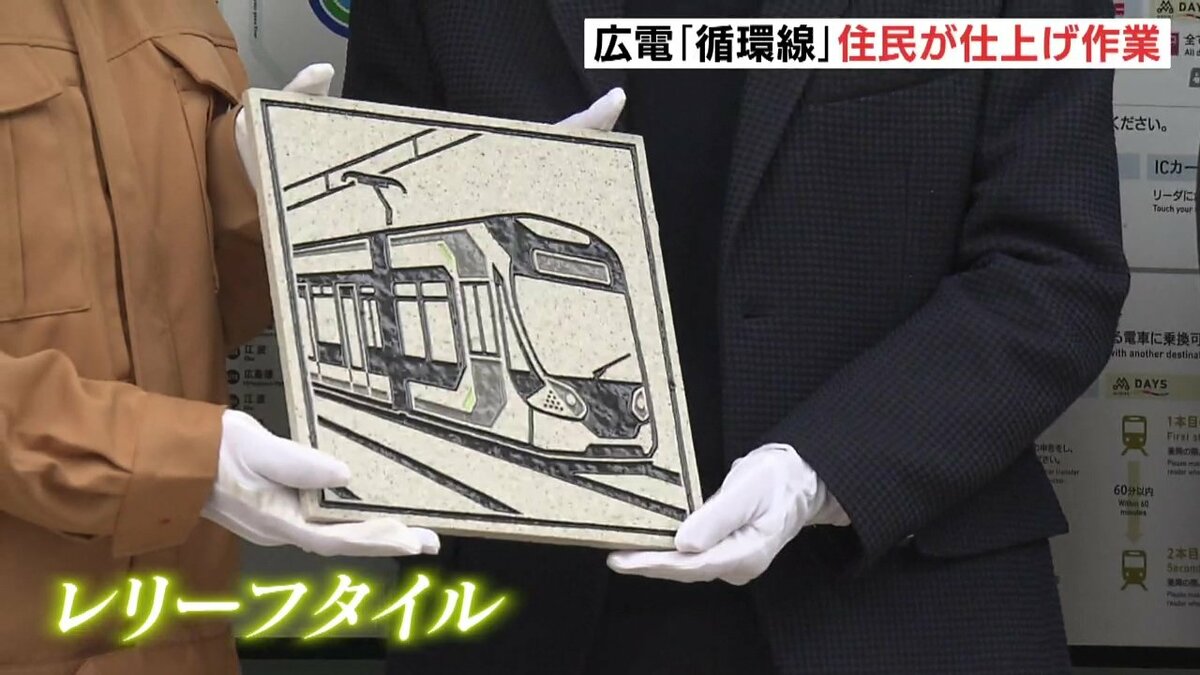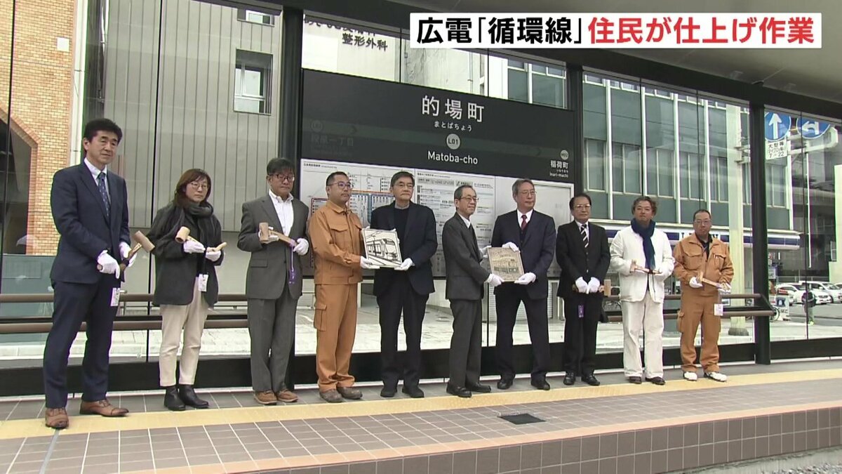 広島市の中心部を周回する「循環線」開業を1週間後に控え、的場町の住民が貸切電車で新ルートを一足先に体験しました。住民たちは、停留場で仕上げ作業の「レリーフタイル」を設置しました。