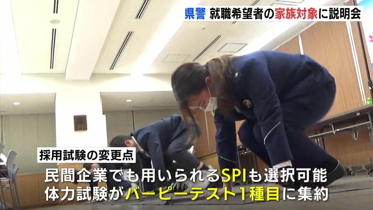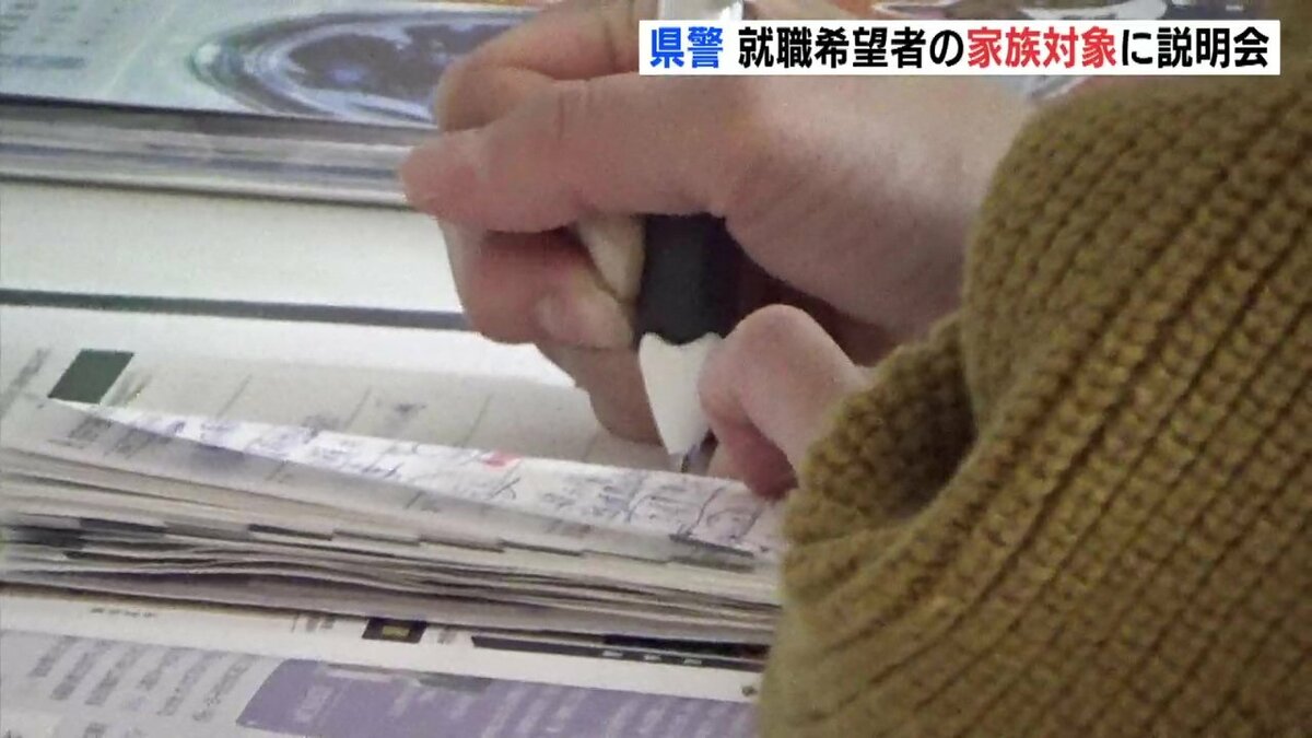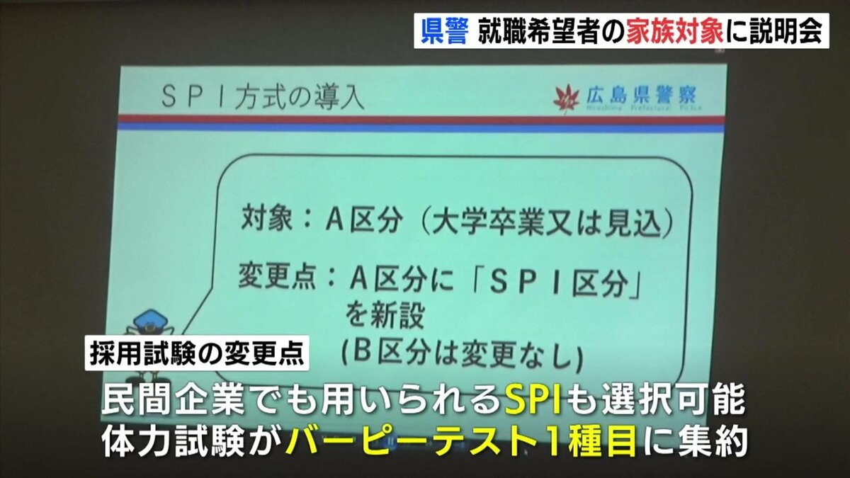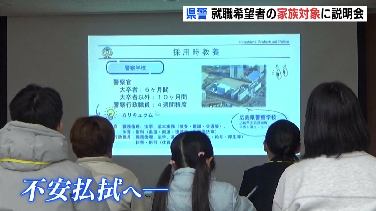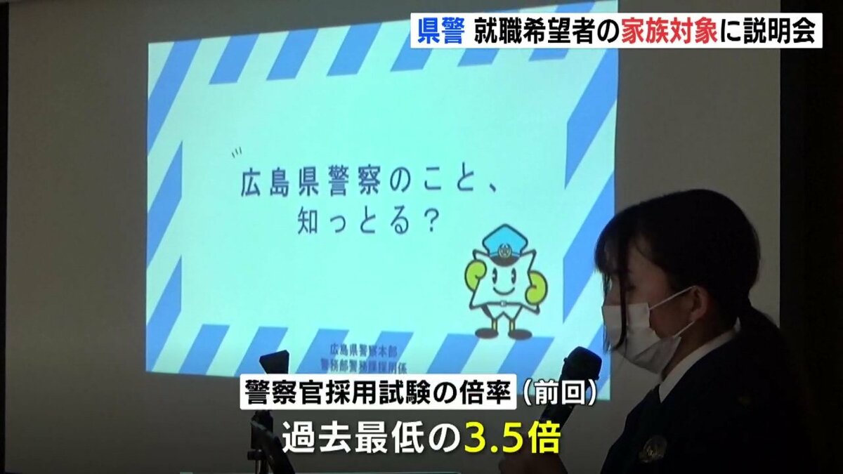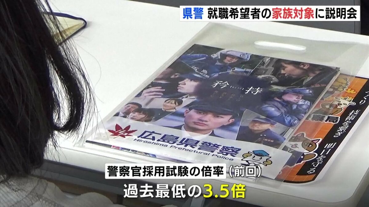 説明会は、警察職員を目指す人の家族を対象に開かれました。広島県警では、警察官採用試験の倍率が過去最低を記録するなどなり手の減少が続いています。
