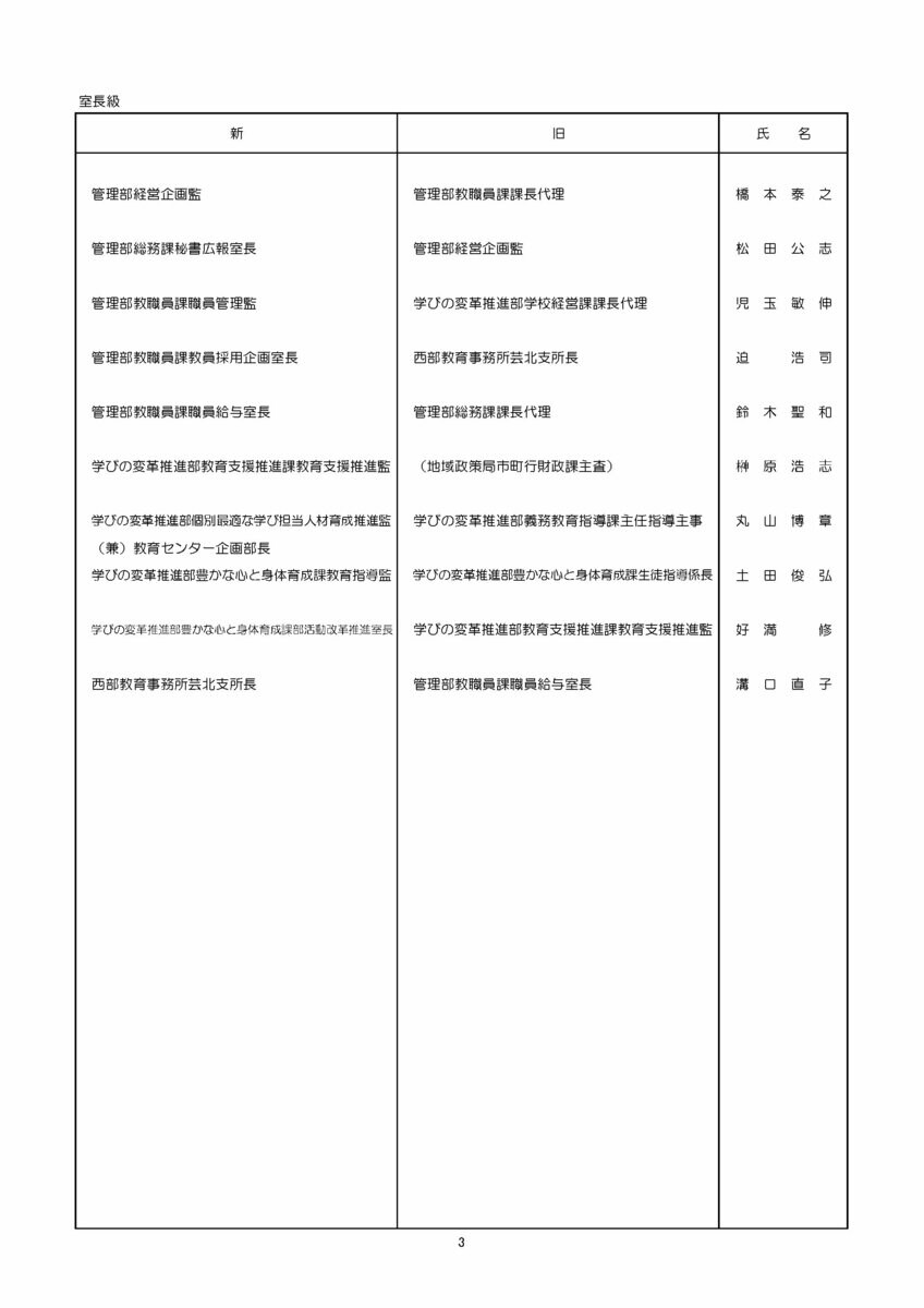 県教委は人事異動の基本的な考え方として「これまで取り組んできた『学びの変革』を着実に推進し、様々な教育施策を迅速かつ適確に推進できるよう、適材適所の人事配置を行う」としています。