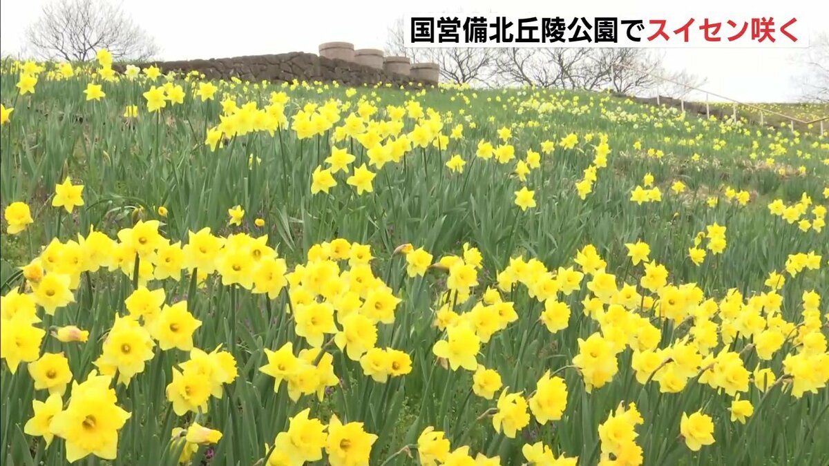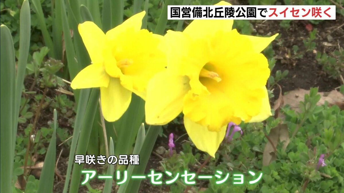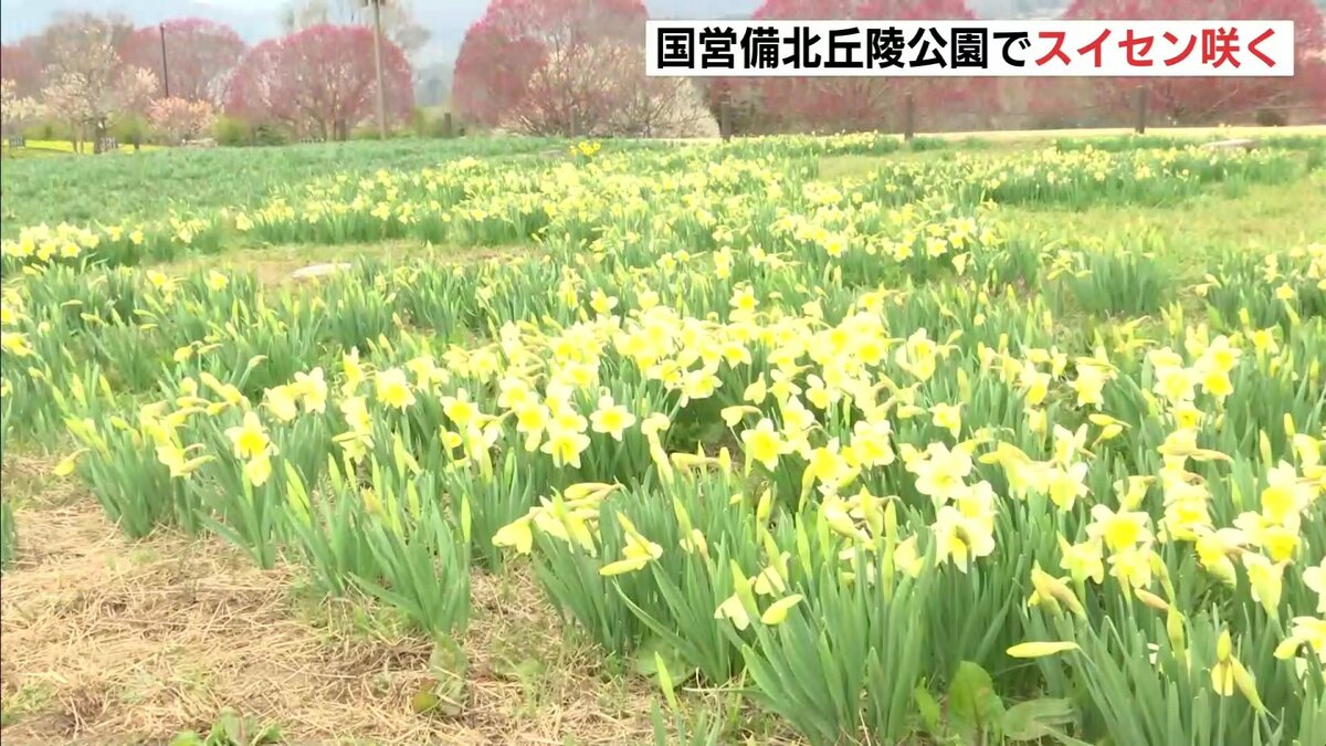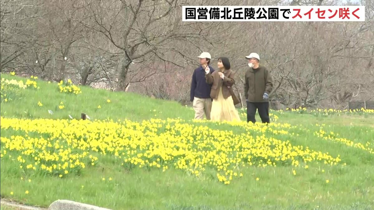 広島県庄原市の国営備北丘陵公園でスイセンの花が咲き始めています。