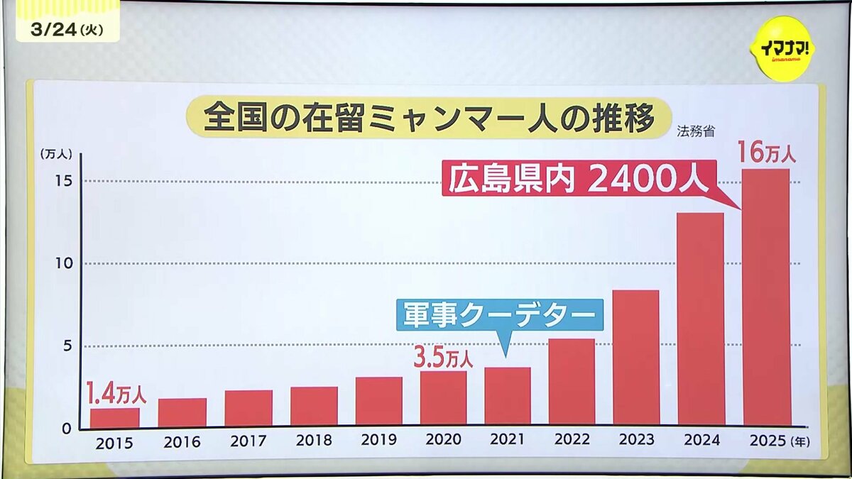 日本では現在、およそ16万人のミャンマー人が暮らしています。その多くは、2021年にミャンマーで起きた軍事クーデターの後に来日した人たちで、広島県内でも2400人ほどが暮らしています。