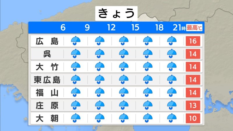 きょうは、日本の南を前線を伴った低気圧が進むため、1日雨でしょう。やむ時間もありますが、雨脚や風が強まるタイミングもありそうです。最高気温はきのうとくらべると5℃前後低く、北風が冷たく感じられる見込みです。最高気温は広島16℃、福山・呉14℃、庄原13℃の予想です。風を通しにくい服装で出かけると安心です。